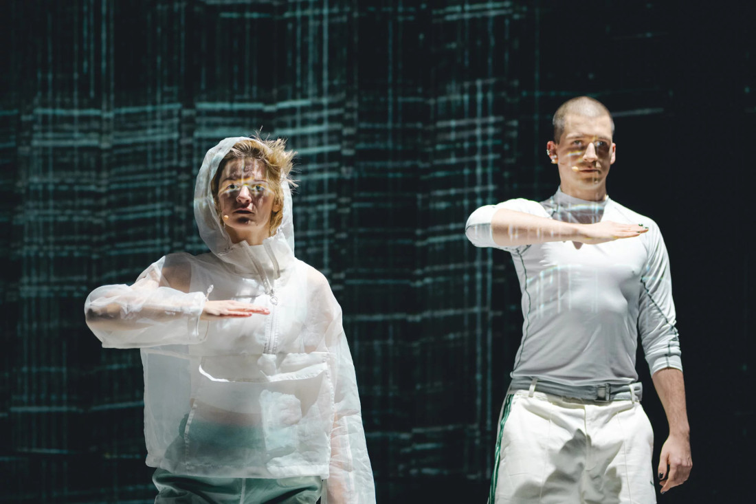 Reżyser bardzo zgrabnie skacze pomiędzy estetykami, bo w “Teorii zmęczenia” nie ogranicza się do typowego teatru dramatycznego; dostajemy też sceny z pogranicza teatru tańca, mocno choreograficzne momenty. Świetnie ogląda się na przykład sekwencję stylizowania na pokaz mody. Wybornie zgrywa się muzyka Michała Smajdora (bardzo dobra przez cały spektakl, mocno futurystyczna) ze światłem i wideo, za które odpowiedzialny jest Jakub Kotynia. Dzięki tej konsekwentnej estetyce “Teoria zmęczenia” jest niezwykle spójna, przez co ogląda się ją z rosnącą przyjemnością i jednocześnie można dać się łatwo wciągnąć w proponowany na scenie świat; niemniej, dzięki różnorodności wizualnej zawartej w spektaklu, nie ma szans się nudzić, bo zupełnie nie wiadomo co wyskoczy zza rogu. Dodatkowo, każda z obranych przez Juszczaka estetyk ma racjonalne zakotwiczenie w tekście i jest bezproblemowo argumentowana w spektaklu.