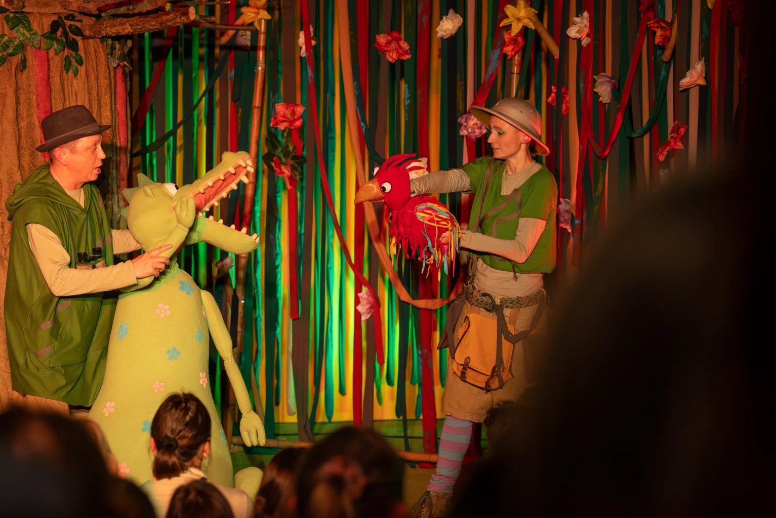 Punch Mama z niezwykłym wyczuciem buduje spektakl, zachowując balans między humorem a empatią wobec małych lęków. Jest dużo ruchu, jest muzycznie, ale i jest oddech, by emocje mogły naturalnie wybrzmieć. Dzięki Dominice Miękus i Andrzejowi Korkuzowi aktorskiemu duetowi, który jest jak perpetuum mobile, spektakl nie traci tempa ani na chwilę. Ich sceniczna energia napędza akcję i utrzymuje cały czas kontakt z młodą publicznością, włączając ją do działania, do tańca i do śpiewu. Dominika Miękus, która jest przewodniczką tej wyprawy do teatralnej dżungli, ale też wciela się w postaci przyjaciół Puszka, Papugę, Małpę i Panią Doktor, łączy żywiołowość z czułością. Tworzy wielobarwną mozaikę emocji i nastrojów, plastycznie różnicuje charaktery postaci, gdzie każda z nich ma własny rytm, gest i styl. Ten aktorski radosny żywioł harmonijnie wpisuje się w prostą, a jednocześnie kompletną scenografię Mikołaja Maleszy, która od samego wejścia do Sali Przytulakowej wprowadza widza w świat teatralnej dżungli. Długi korytarz, którym idzie się na widownię, otulony jest zielenią i miękkim, rozproszonym światłem. Zieleń też wypełnia scenę i widownię, liany okalają ściany, jest zielony sufit, a na samym środku stoi drzewo niczym serce tego świata. Tak zaaranżowana przestrzeń pobudza dziecięcą wyobraźnię i zmysły, bo chwilami można odnieść wrażenie, że ten sceniczny kawałek tropiku pulsuje, oddycha, skrapla się i nawet pachnie.