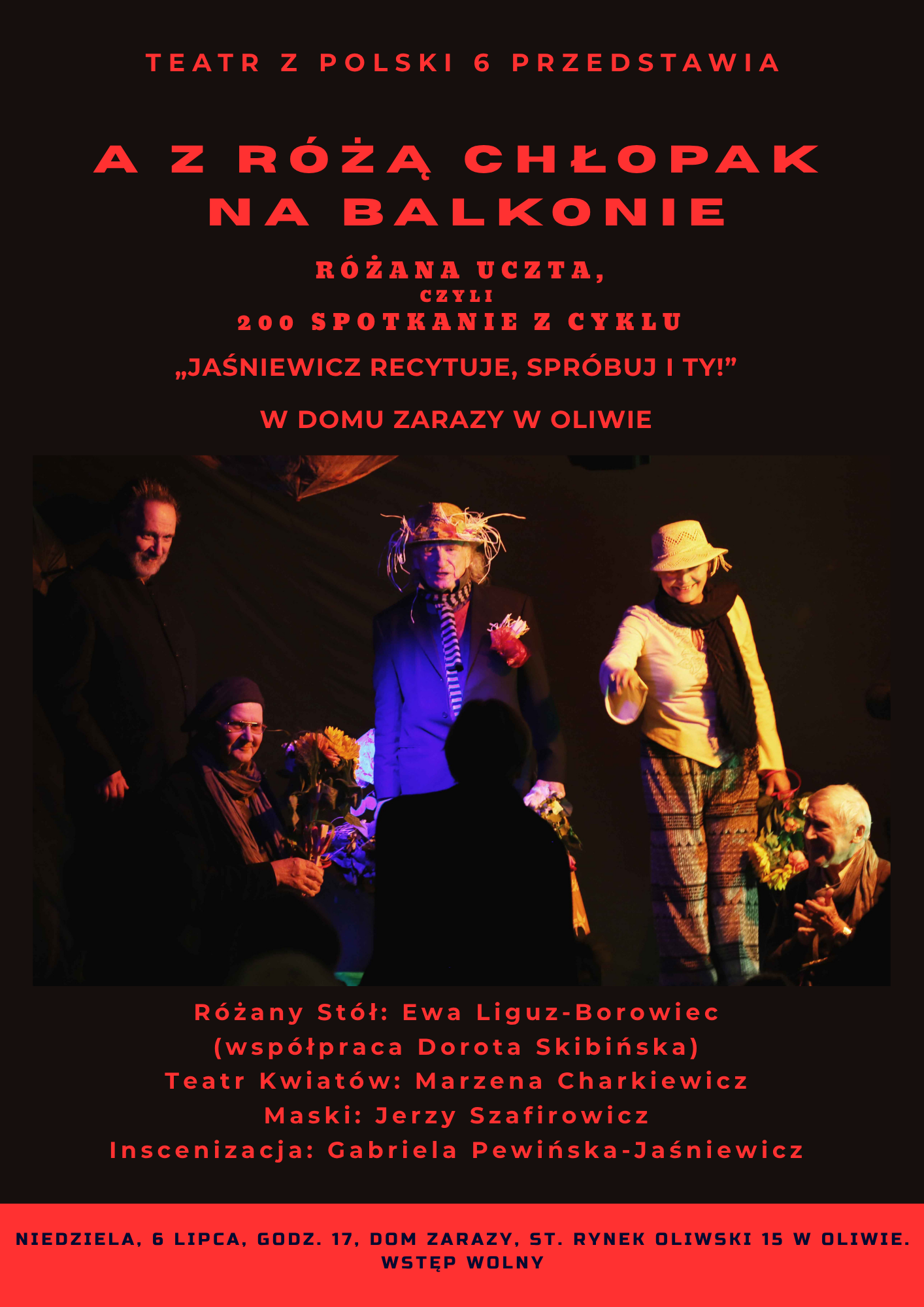 „Mijają wojny, nawałnice zdarzeń, lecz słońce jest, i wiatr, i deszcz, i dzięki temu róża jest, a z różą chłopak na balkonie, bo nikt miłości nie ujarzmi”… - tak w 2015 roku, na scenie oliwskiego Domu Zarazy, Ryszard Jaśniewicz kończył swój monodram „Ostatnia lekcja aktorstwa”. Do finałowej sceny zaprosił wówczas właśnie uczestników warsztatów.