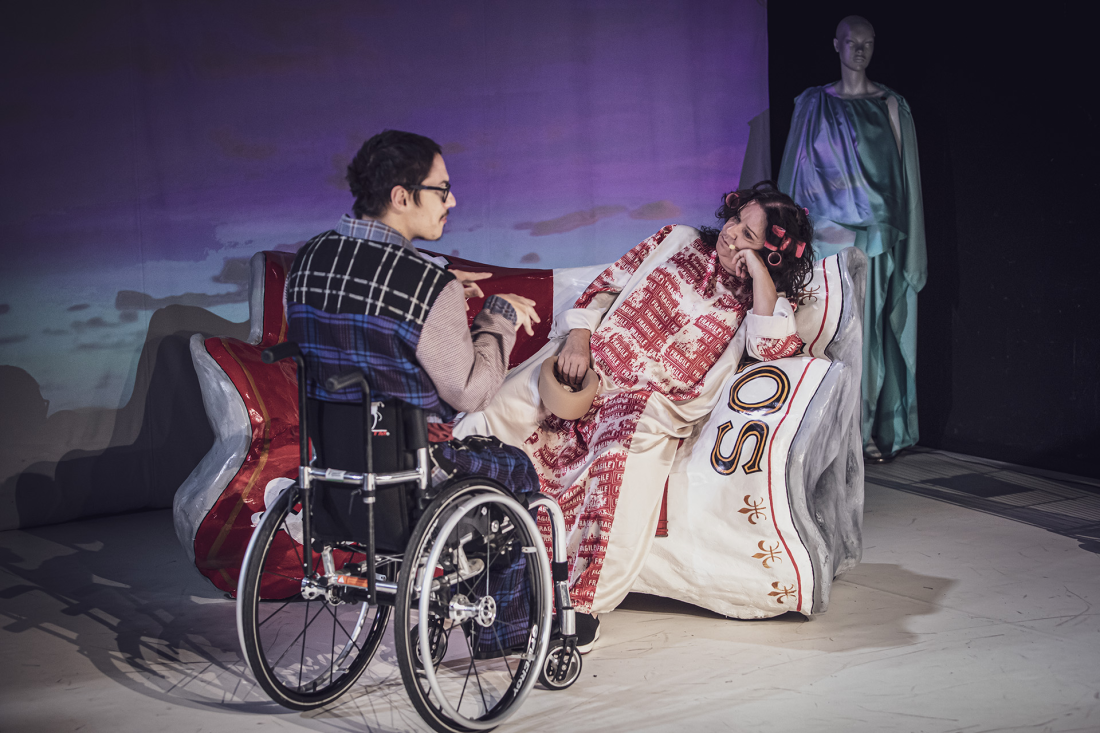 W centrum wydarzeń pozostaje Gilbert Grape – w tej roli debiutujący na scenie Ludowego Marcin Mazurek, który wraz z tym spektaklem zasila szeregi zespołu – uwięziony między opieką nad bratem z niepełnosprawnością (Arnie grany jest przez Kajetana Sługockiego, aktora z niepełnosprawnością, co znacząco podnosi autentyczność relacji scenicznych) a chorą matką (Beata Schimscheiner). Twórcy wprowadzają widzów do świata Grape’ów niczym do kolejnego odcinka telewizyjnego american show: wszystko zanurzone jest w plastikowej, przerysowanej, zbyt gładkiej amerykańskości. To dzięki gęstej sieci kulturowych cytatów, odwołań i klisz, które przenikają wszystkie warstwy przedstawienia – od tekstu, przez scenografię i wizualizacje (Jakub Kotynia), po choreografię (Martyna Dyląg) i kostiumy (Julia Zawadzka). Scena przypomina składowisko ikon popkultury: makieta domu, makieta miasta zaludniona karaluchami pędzącymi ku swojemu „dobru”, sklepowe półki uginające się od plastikowych produktów, trawnik jak z reklamy, sofa wyglądająca jak zgnieciona puszka słodkiego napoju, pojawiający się Elvis Presley. To przestrzeń, w której wszystko jest przetworzone, jakby bohaterowie żyli w świecie po przejściu przez fabrykę konserw. I rzeczywiście – twórcy zanurzają tę historię w czymś, co można nazwać „amerykańskim szlamem”: wszystko tu jest skondensowane jak gazowany napój w hermetycznej puszce, która w końcu musi eksplodować.