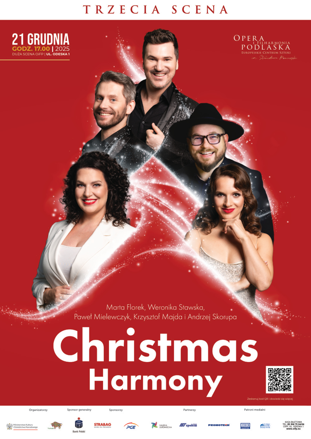 21 grudnia na Dużej Scenie przy Odeskiej odbędzie się koncert w ramach cyklu Trzecia Scena - Christmas Harmony. To wydarzenie wypełnione najpiękniejszymi świątecznymi utworami w nowych, wielogłosowych interpretacjach, a wykonają je artyści na co dzień związani m.in. z Teatrem Muzycznym Roma w Warszawie, Operą i Filharmonią Podlaską w Białymstoku, Teatrem Muzycznym w Łodzi, Teatrem Rozrywki w Chorzowie i innymi polskimi scenami muzycznymi. Usłyszymy m.in „White Christmas”, „Santa Claus Is Coming To Town” czy „Joy To The World”, ale nie zabraknie również polskich akcentów w postaci utworów takich jak: „Nie ma nie ma ciebie” czy „A kto wie, czy za rogiem”. Początek koncertu o godz. 17.00.