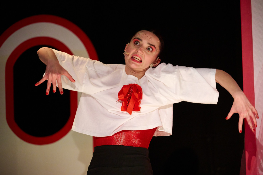 W sali kameralnej Miejskiego Teatru Miniatura w Gdańsku zaaranżowano intymną, niemal przytulną przestrzeń. Widzowie i widzki mogą usiąść na poduszkach ułożonych na przodzie sceny. To automatycznie zaciera granicę między twórcami a publicznością, stwarza atmosferę spotkania, teatralnej rozmowy. Zarówno poduszki, jak i elementy dekoracji mają różne odcienie czerwieni. To jednak czerwień oswojona przez pufy, miękkie dywany, tiule i mnóstwo brokatu. Oprócz tego w kilku miejscach umieszczono białe ekrany w kształcie podpasek. Już przed rozpoczęciem spektaklu pojawiają się na nich krótkie filmiki nawiązujące stylistyką do TikToka. Nagle w tę bezpieczną, dobrze znaną (szczególnie młodym odbiorcom) przestrzeń, wdziera się głośny dźwięk telefonu. Nastoletnia Magda (Magdalena Gładysiewicz) odbiera i słyszy zniekształcony głos i groźbę: „Masz 28 dni”. Pojawia się niepokojąca muzyka, czerwień scenografii zaczyna przerażać. Timer zawieszony nad sceną uaktywnia się i rozpoczyna odliczanie. Wydaje się, że to początek horroru. Jednak Magda szybko budzi się ze snu. Zanim zrozumie, co się właśnie wydarzyło, na scenę wkracza gadająca Macica (Kamil Marek Kowalski) i informuje, że właśnie rozpoczynają się przygotowania do imprezy, święta, a może rewolucji, jaką w życiu dziewczyny jest pojawienie się pierwszego okresu.