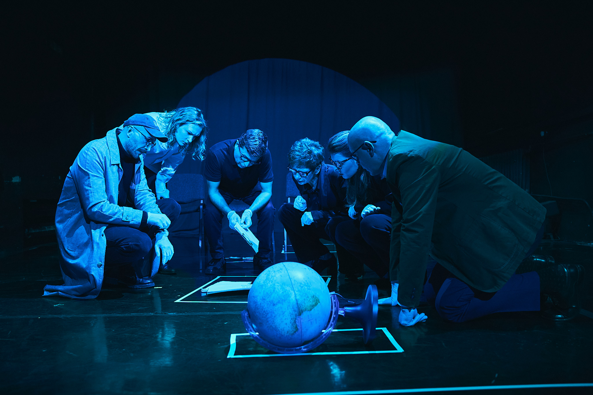 Filip Jaśkiewicz, reżyser performatywnego czytania Atlantis. Fragmentów przyjmuje konwencję silnie inspirowaną praktyką policyjno-detektywistyczną z pewnym odrealnionym, surowym sznytem bezosobowości. Wszyscy możemy przywołać sobie jakiś thriller czy kryminał, w którym zmęczony detektyw w paskudnym nastroju rozpracowuje sprawę. W adaptacji tekstu Nowotarskiego do tej atmosfery noir dochodzi jeszcze pewna chłodna sterylność badania. Wszystko spowija zimne, niebieskawe światło, trochę jak jarzeniówka nad stołem do sekcji zwłok. Z jakiegoś powodu przypominają mi się sceny szpitalne z kolejnych części Psów Władysława Pasikowskiego, jednak tutaj nie ma Waldemara Morawca (Cezary Pazura), który by sygnalizował emocjonalne napięcie. Być może jakaś emocjonalność znajdzie się wśród artefaktów przeszłości. Na scenie znajduje się sześć krzeseł, globus, stojak do nut, telefon, jakieś szpargały, śmieci. Wszystkie odznaczone białą taśmą, niby obrysowane kredą policyjną – dowody w sprawie. Tylko jakiej? Kogo lub czego szukają detektywi w składzie: Paweł Gładyś, Józef Hamkało, Karol Kadłubiec, Karolina Kochańska, Justyna Król, Małgorzata Machowska?