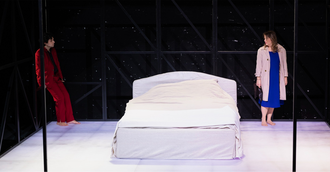 Efekt ten potęguje oszczędna scenografia autorstwa Katarzyny Stochalskiej. W centrum widzimy łóżko obudowane żelaznymi prętami sugerującymi zarysy ścian, drzwi, okien. Niby to małżeńska sypialnia, ale bardziej jednak symboliczna klatka. Biel strojów i pościeli kontrastuje z otaczającą ciemnością. Muzyki prawie nie ma. Świateł jest tyle, żeby było coś widać; skupiają całą uwagę na bohaterach. Wizualizacje, gdy już się pojawiają, są czarno-białe i przedstawiają tylko Ledwoń, Salmana albo oboje naraz, co ilustruje wyidealizowane marzenia bohaterów o sobie nawzajem. To są wszystko proste chwyty, ale skuteczne. Pasują do tekstu okrojonego z wszelkich szczegółów, włącznie z imionami głównych bohaterów. Jeden Baste (Krzysztof Olchawa) ma imię, ale tylko dlatego, że pojawia się ono w dialogu.