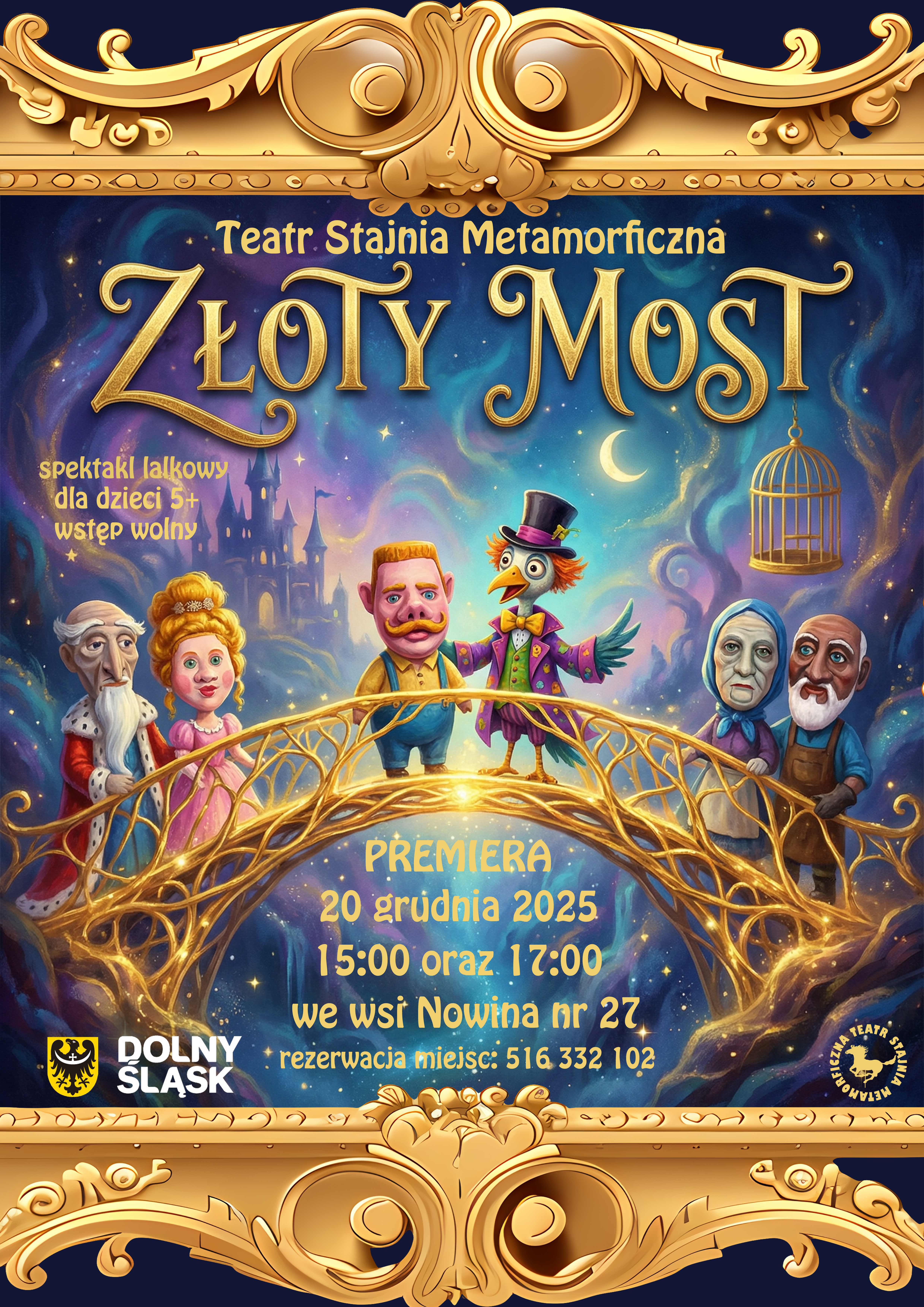 Teatr Stajnia Metamorficzna zaprasza na premierę spektaklu lalkowego „Złoty Most”, która odbędzie się 20 grudnia o godzinie 15:00oraz 17:00 w malowniczej wsi Nowina nr 27 (Gmina Ziębice) na Dolnym Śląsku.