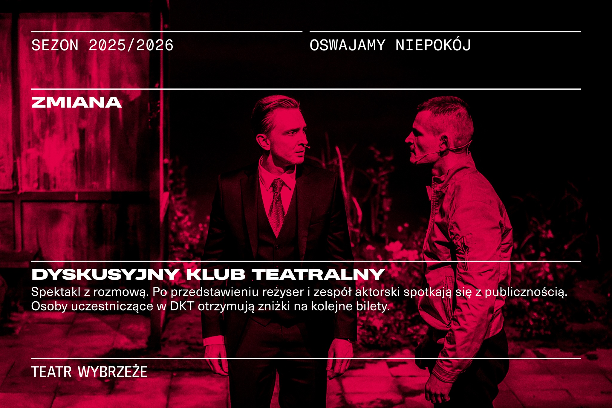 Zapraszamy na 88. spotkanie w ramach Dyskusyjnego Klubu Teatralnego do spektaklu „Zmiana”. W rozmowie weźmie udział zespół aktorski.