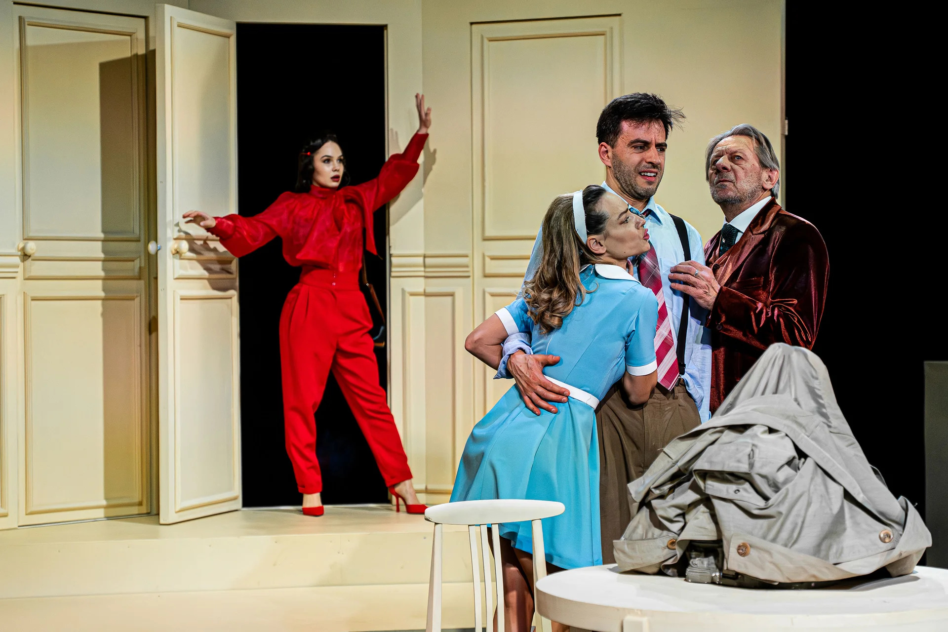 Klasyczna angielska farsa o parze, która “pożycza” meble od sąsiada, żeby zrobić wrażenie na odwiedzającym ją pierwszy raz ojcu dziewczyny. Źródłem humoru jest tu pomysł zamiany światła i ciemności. Pierwsze sceny, kiedy światło w mieszkaniu jeszcze działa, na scenie odgrywane są w ciemności. Kiedy w świecie spektaklu psuje się instalacja, na scenie zapala się światło, a obsada z dużym poświęceniem wpada na meble, zabawnie udając, że porusza się w ciemności. Spektakl powstawał w nietypowy sposób, w systemie SCRUM, bez udziału osoby reżyserskiej.