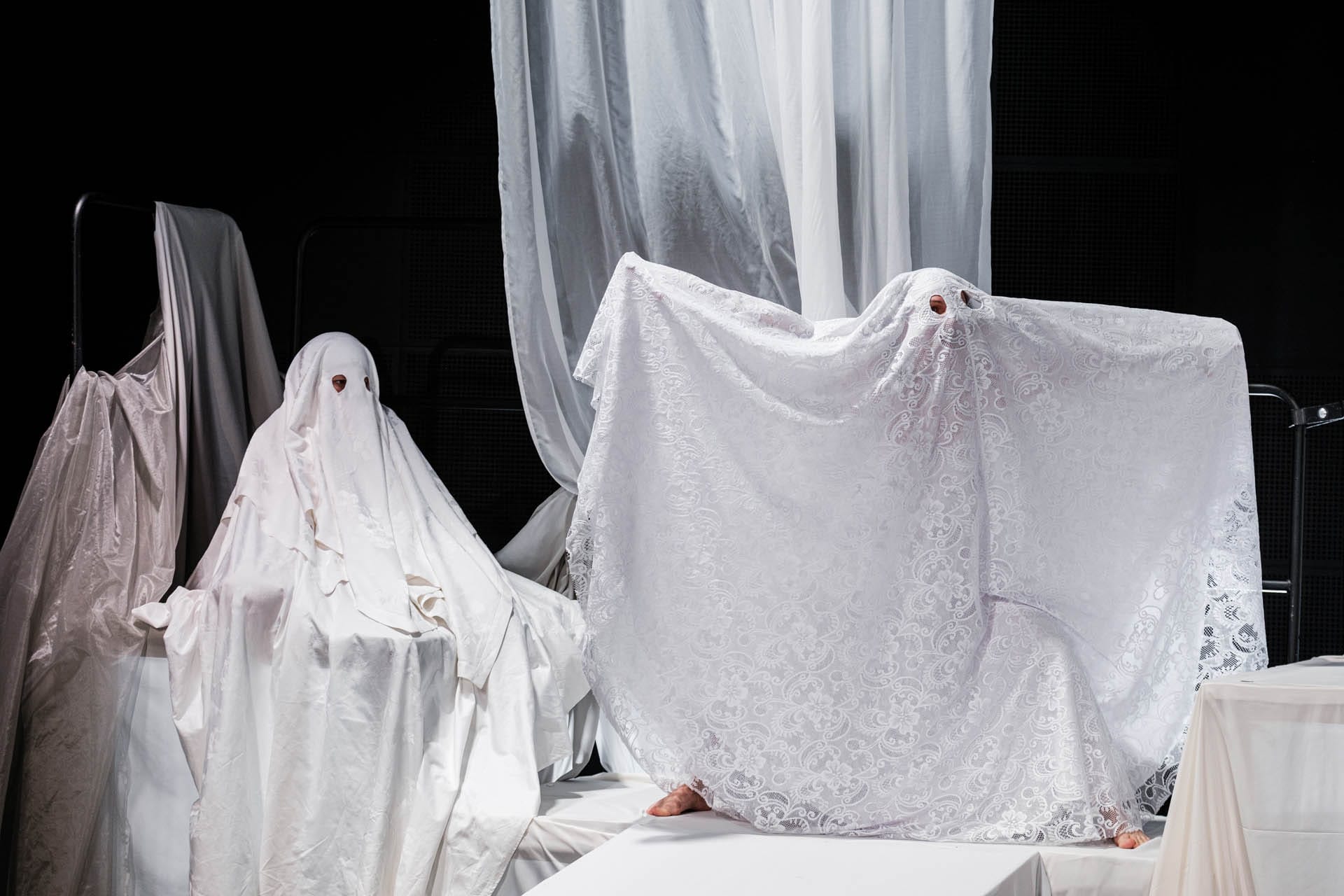 Intrygujący spektakl o przerabianiu swoich traum i oczyszczaniu atmosfery wokół siebie. “Wchodzenie” kolejnych szekspirowskich Duchów Ojców to seans trudnych wspomnień z kontaktu z rodzicami, szefami, reżyserami. Wspomnienia łączą się tu z cytatami z kultury popularnej i tekstami z memów. Ten niezwykły seans spirytystyczny rozgrywa się w niemal całkowicie białej przestrzeni, a obsada przez cały spektakl występuje z narzuconymi na głowy prześcieradłami z otworami na oczy.
