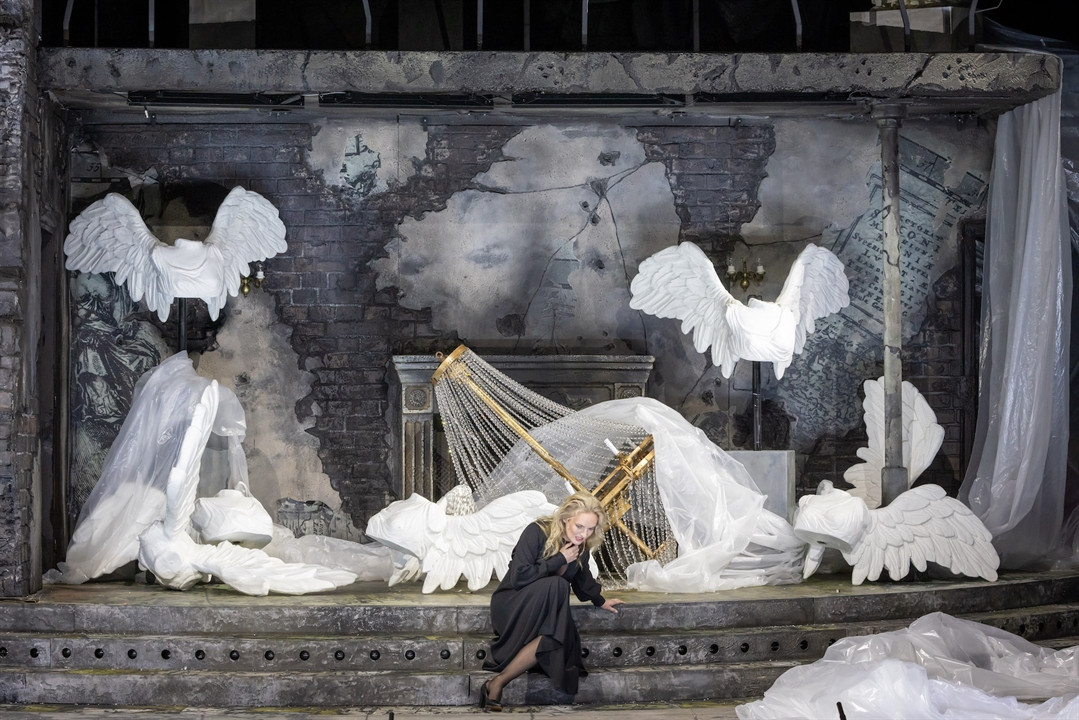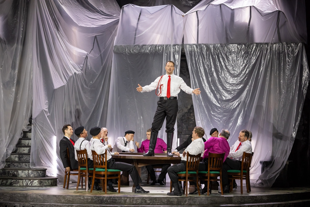 To jednak tylko jedna warstwa owego "Snu Niepodległej Pol (s)ki". Inna, głębsza i bardziej rozbudowana, dotyczy wymiaru, by tak rzec, genderowego. Karolina Sofulak w swoim spektaklu stara się odwrócić kierunek dotychczasowych wystawień "Hrabiny" i ukazać historię - jak sama mówiła w wywiadach - niejako z punktu widzenia bohaterki. Zdaniem reżyserki żarty z owdowiałej kobiety, która ma swoje zdanie i ambicje, są już dziś nie na miejscu - w najlepszym razie okazują się nieśmieszne. Dlatego Hrabina w kreacji Aleksandry Orłowskiej ukazana zostaje jako postać silna i władcza, niemająca w sobie za grosz naiwności. W pierwszej odsłonie przedstawienia bohaterka ma na sobie strój florecistki i ćwiczy się w szermierce. W czasie arii Kazimierza wyznającego jej miłość ("Od twej woli") bohaterka dosłownie nad nim góruje - znajduje się piętro wyżej, potrząsa włosami i beznamiętnie spogląda z wysokości: to ona jest tu panią sytuacji. By podkreślić inne odczytanie tej postaci, w kluczowej scenie balu bohaterka pojawia się w eleganckich czarnych spodniach i żakiecie oraz czerwonej bluzce - choć w libretcie mowa przecież o pięknej sukni rozdartej przez niezdarnego Kazimierza. Niby wszystko brzmi dobrze, Hrabina nie jest żałosna ani naiwna, ale okazuje się przez to dumna, pyszna i próżna. Wszystkie znaczące sceny i rekwizyty podkreślają raczej jej wyniosłość: czy będzie to przymierzany przez nią świecący diadem przypominający zwierzęce rogi, czy też "tron" w postaci równie błyszczącego wielkiego żyrandola, na którym zasiada bohaterka. Hrabina (jak sama śpiewa) chce bowiem od świata hołdu, oczekuje wyłącznie podziwu - dlatego w gruncie rzeczy tak satysfakcjonujące okazuje się zrujnowanie jej kreacji przez Kazimierza (nie chcę zdradzać, jak zostało to tutaj zainscenizowane - sprawdźcie sami, naprawdę jest to moment wart wszystkich pieniędzy). Poirytowana bohaterka cierpi, ale trudno mieć dla niej wiele współczucia.
