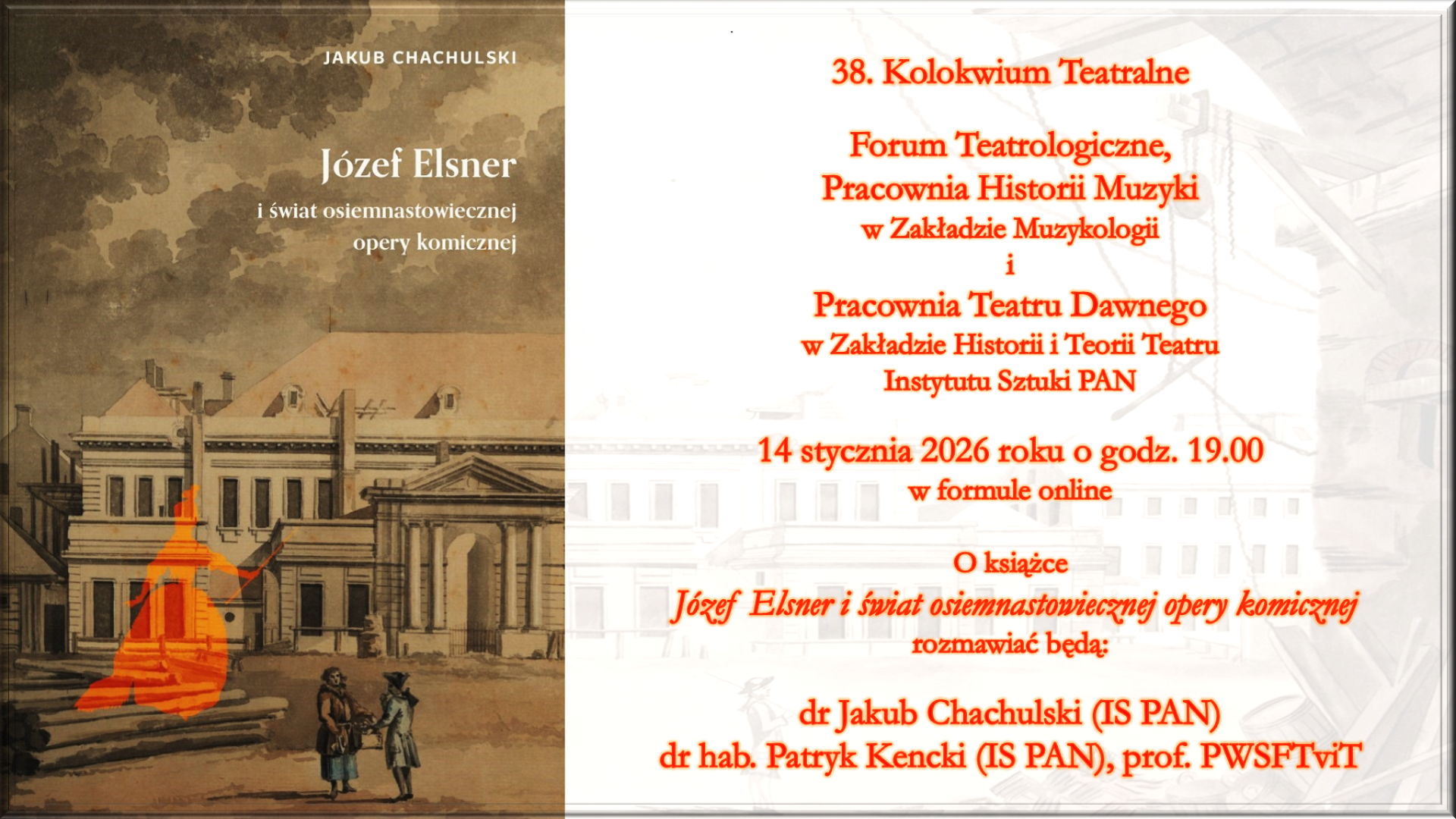 Forum Teatrologiczne, Pracownia Historii Muzyki w Zakładzie Muzykologii i Pracownia Teatru Dawnego w Zakładzie Historii i Teorii Teatru Instytutu Sztuki PAN zapraszają do udziału w 38. Koloakwium Teatralnym, które odbędzie się w środę 14 stycznia o godz. 19.00 w formule online.