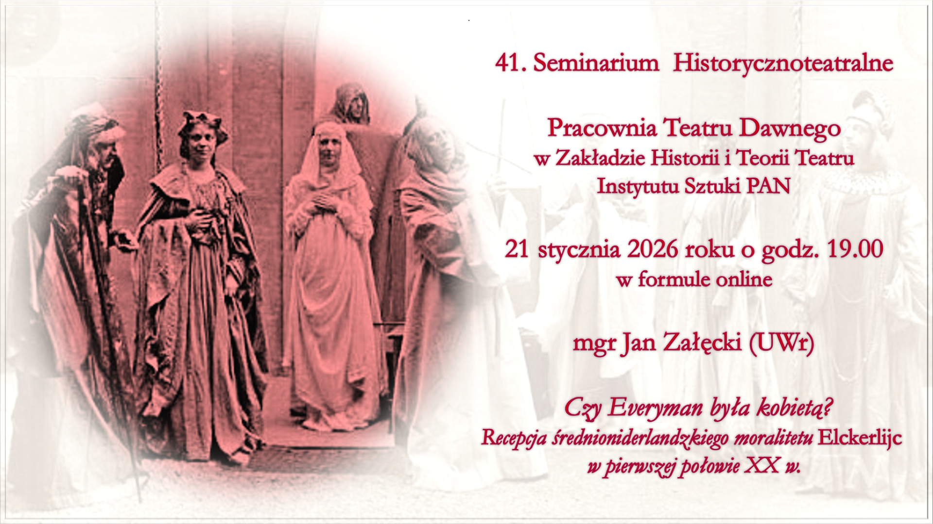 Pracownia Teatru Dawnego w Zakładzie Historii i Teorii Teatru Instytutu Sztuki PAN zaprasza do udziału w 41. Seminarium Historycznoteatralnym, które odbędzie się w środę 21 stycznia o godz. 19.00 w formule online.