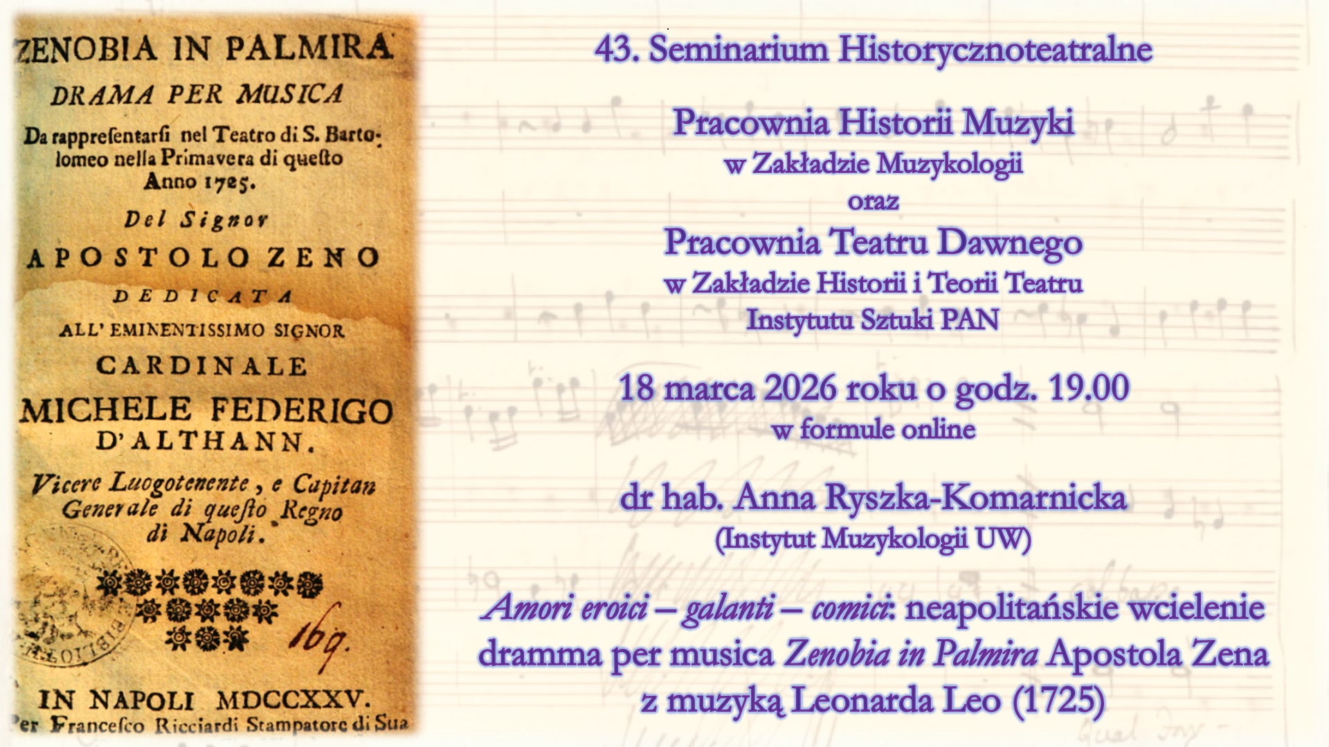 Pracownia Historii Muzyki w Zakładzie Muzykologii oraz Pracownia Teatru Dawnego w Zakładzie Historii i Teorii Teatru Instytutu Sztuki PAN serdecznie zapraszają do udziału w 43. Seminarium Historycznoteatralnym, które odbędzie się w środę 18 marca o godz. 19.00 w formule online.