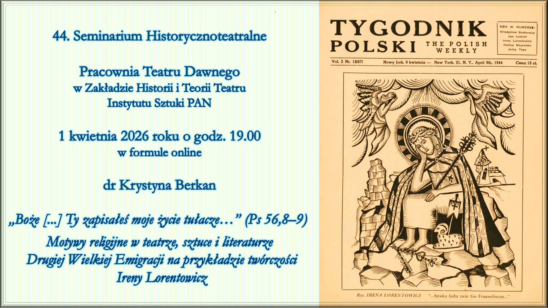Pracownia Teatru Dawnego w Zakładzie Historii i Teorii Teatru Instytutu Sztuki PAN serdecznie zaprasza do udziału w 44. Seminarium Historycznoteatralnym, które odbędzie się w środę 1 kwietnia o godz. 19.00 w formule online.