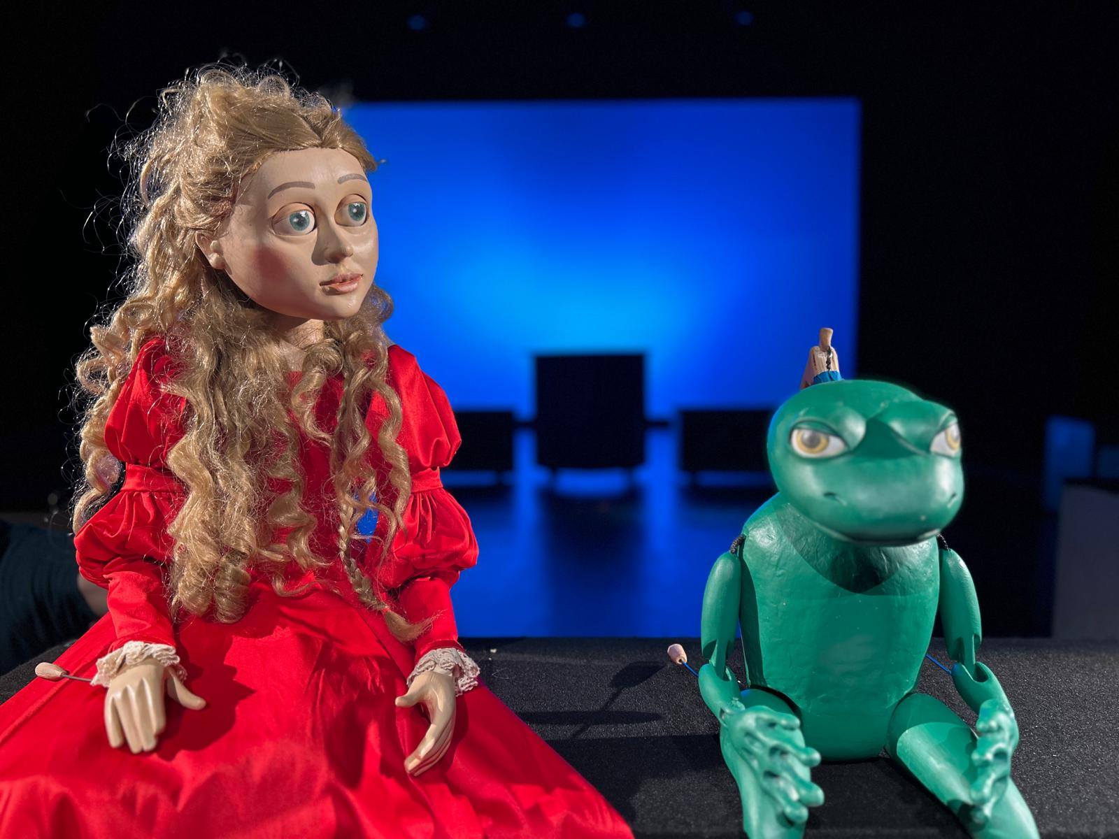 Na szczęście zgodnie z długoletnią tradycją Baja Pomorskiego, na którego scenie oglądaliśmy już najrozmaitszego autoramentu lalki, bo nie brakowało ich np. w „Gdzie się podział Baku”, „Frankensteinie. Reportaż” w „Seed. Nibylandia”, a zwłaszcza w przedstawieniu „Lalki śpiewają” czy „Szewczyk Dratewka”, i tutaj spotykamy kilka rodzajów, zaprojektowanych przez Ewelinę Brudnicką, lalek. Najsłodziej prezentuje się chór złożony z mupetów w kostiumach kucharzy i jawajki jako wróżki. Głównych bohaterów grają większych rozmiarów lalki zapożyczone z japońskiego teatru bunraku. Ich postaci są wielkości 1/3 do 3/5 aktora. Główni bohaterowie istotnie powinni być więksi i mogą mieć odsłonięte twarze, które nie powinny oddawać emocji bohatera, bo te okazywane są ruchem lalki i głosem; reszta wykonawców występuje w czarnych kapturach. Przynajmniej w teatrach japońskich. Ale lalki te trudne są do ogrywania, bo wymagają trzyosobowej animacji, poruszają nawet oczami, co tutaj mogliśmy zauważyć tylko u postaci Królewny, za którą stała Marta Parfieniuk- Białowicz i Żaby Mariusza Wójtowicza, obu wykonanych z litego drewna, specjalnie przez Rafała Budnika, słynnego scenografa, rzeźbiarza i konstruktora teatralnych lalek. Ponieważ nauka obsługi takiej lalki trwa wiele lat, w Toruniu zza lalek z odsłoniętym twarzami w czarnych kostiumach grali aktorzy.