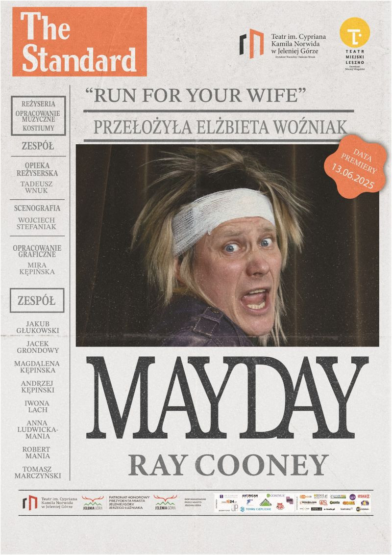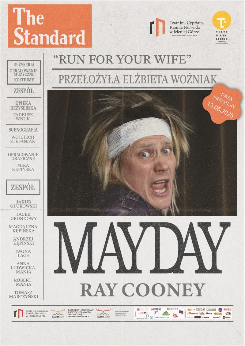 Teatr im. Cypriana Kamila Norwida w Jeleniej Górze zawiadamia o premierze spektaklu „Mayday” („Run for Your Wife”) autorstwa Raya Cooneya w reż. zbiorowej aktorów pod opieką reżyserską Tadeusza Wnuka. Odbędzie się ona w piątek 13 czerwca.