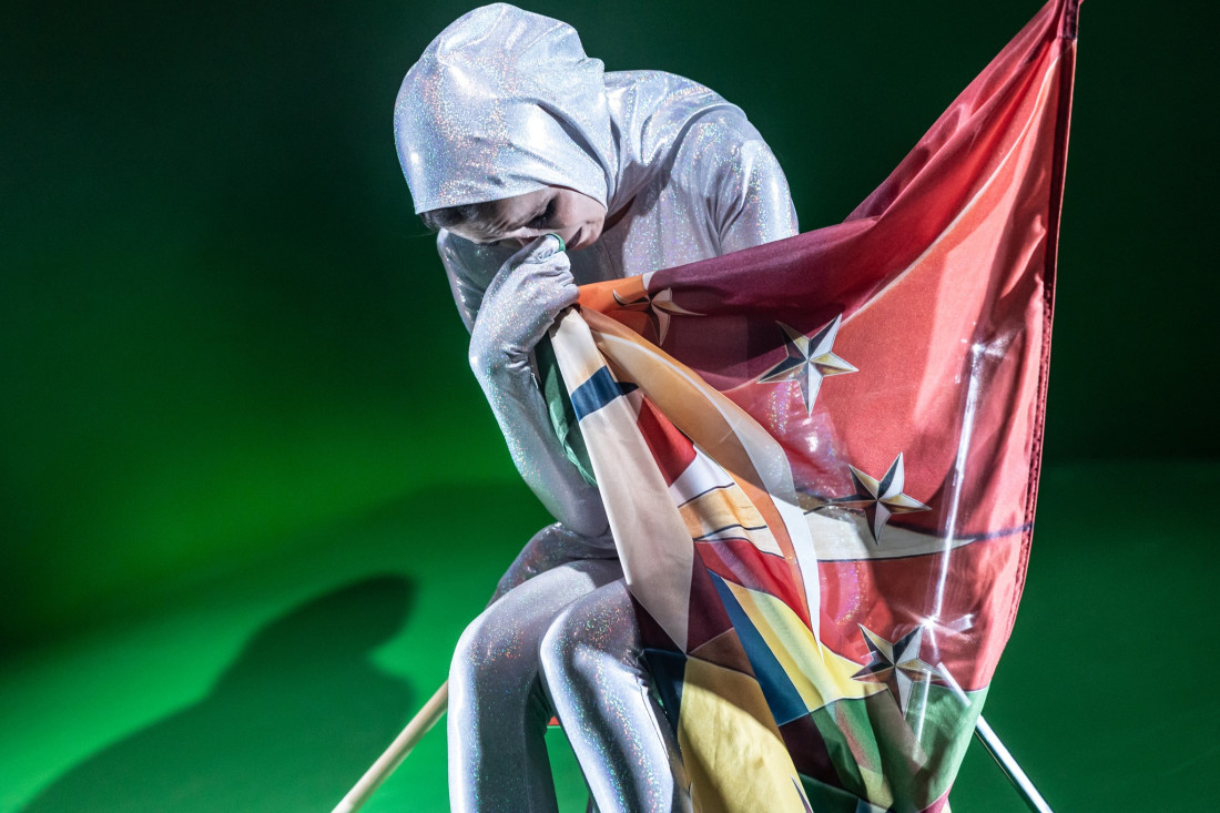 Być może to ze względu na siłę wyrazu postaci oskarżonych i świadkini prowadzące postępowanie ekspertki wypadły znacznie bladziej (w tych rolach Małgorzata Gorol, Zuzanna Galewicz i Weronika Kruszczyńska). A szkoda. W ich dystopijność musiałam wierzyć na słowo – podobnie jak w „łamanie się”, gdy doszło do przesłuchania Anny. Zabrakło mi też zbudowania szerszego kontekstu – przeciekawego przecież – systemu Unii Euro-Islamskiej oraz Instytutu Ludobójstwa i prowadzonych w jego ramach procesów. Coś mogłam sobie dopisać, zerkając do bogatszego tekstu wyjściowego Mikity Iłinczyka; co innego – z „Uległości” Houellebecqa. Ale to, co widziałam na scenie, pozostawiło we mnie niedosyt, a zanurzenie się w świat niekiedy natrafiało na spory opór – mimo interesującej scenografii Łukasza Mleczaka, w której green screen mieszał się z zieloną granicą, oraz futurystycznych i migotliwych mundurów.