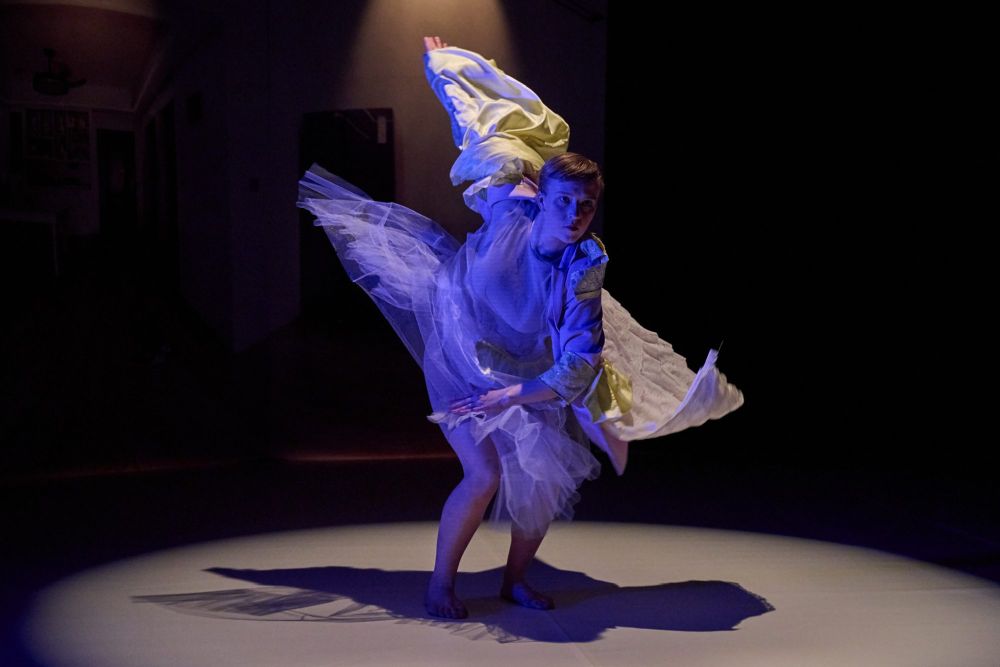 W miarę rozwoju spektaklu jej ciało, coraz bardziej odsłonięte, dochodzi do głosu – jakby decyzja o tańcu nie była jedynie formalnym wyborem, lecz wewnętrzną koniecznością, przejęciem kontroli nad własnym istnieniem. Ostatnia warstwa stroju – cielisty komplet gimnastyczny – może sugerować, że taniec nie jest ani spektaklem dla widza, ani próbą wpisania się w oczekiwania świata, lecz najczystszą, wewnętrzną potrzebą. Dlatego też artystka ostatecznie może pozwolić sobie na taniec z krzesłem, z którym wiruje w rytm muzyki. To moment, w którym wychodzi poza presję konieczności „bycia produktywną”. Już nie próbuje usprawiedliwiać tańca – po prostu tańczy. Może właśnie w tym oddaniu się ruchowi, kryje się prawdziwa wolność.