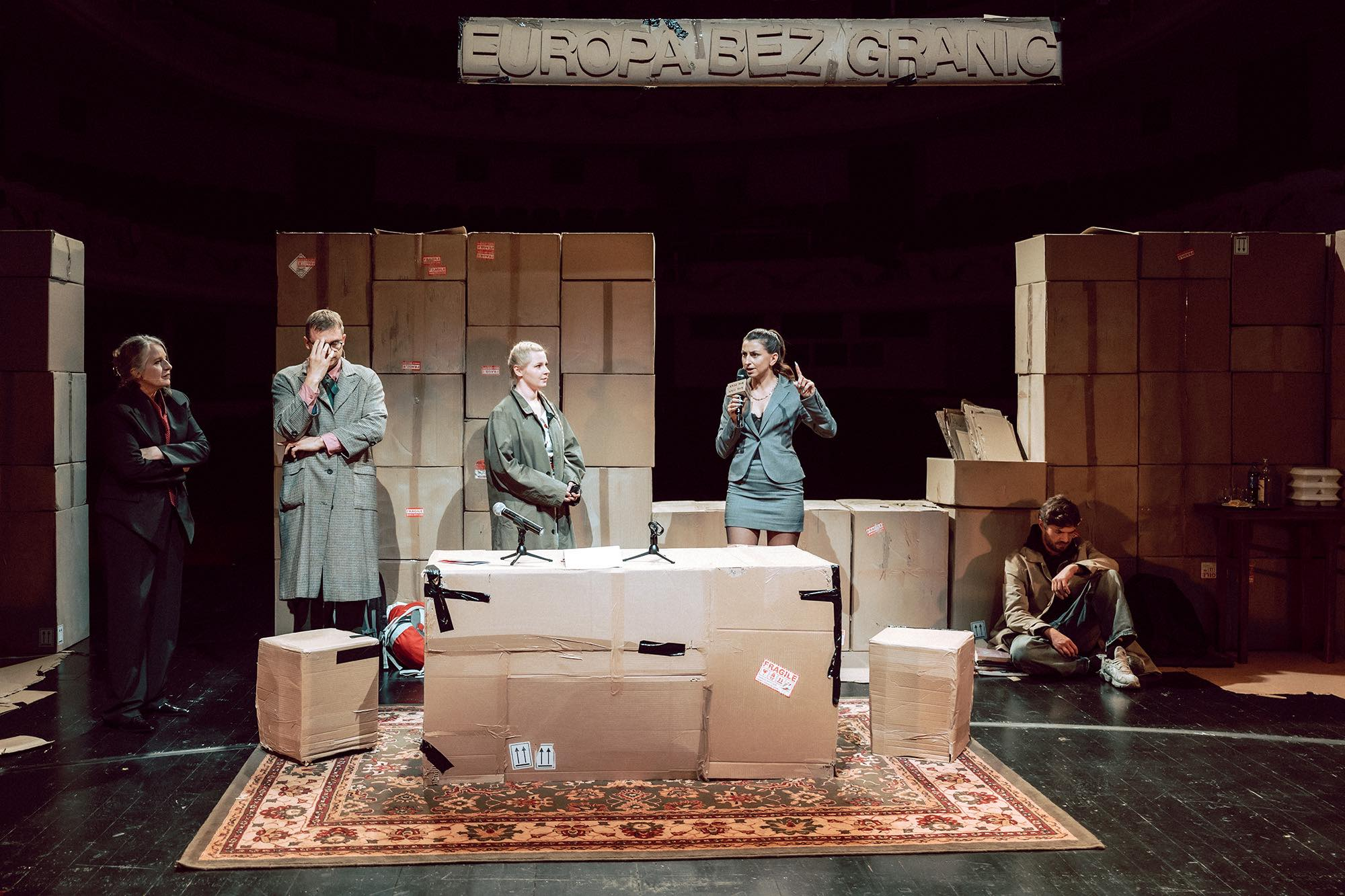 To budulce spektaklu Un-packing w reżyserii Katarzyny Kalwat. W przestrzeni sceny karton staje się metaforą tymczasowości, prowizoryczności, też nietrwałości pamięci. Obok niego ciało – kruche, krwawiące, podatne na upokorzenie – okazuje się jedynym miejscem, w którym zapisuje się historia.