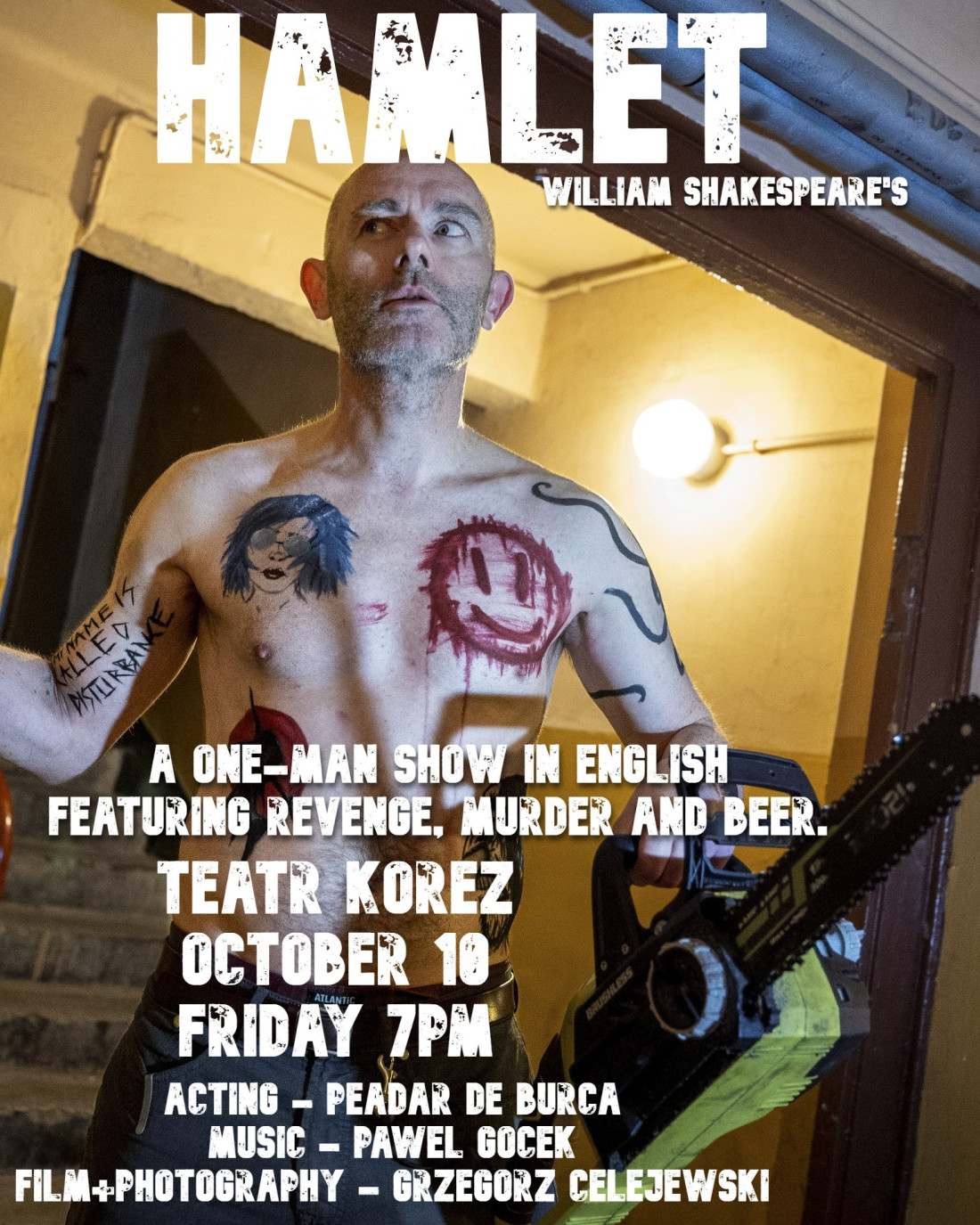 Jeden aktor, osiem ról, gitara, piła, kamera, publiczność i Thunderstruck. Peadar de Búrca przedstawia esencję „Hamleta”. 75 minut intensywnej opowieści w szekspirowskiej angielszczyźnie podanej tak, by była zrozumiała dla polskich widzów znających współczesny angielski. To nie jest spektakl. To wydarzenie.