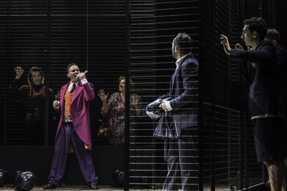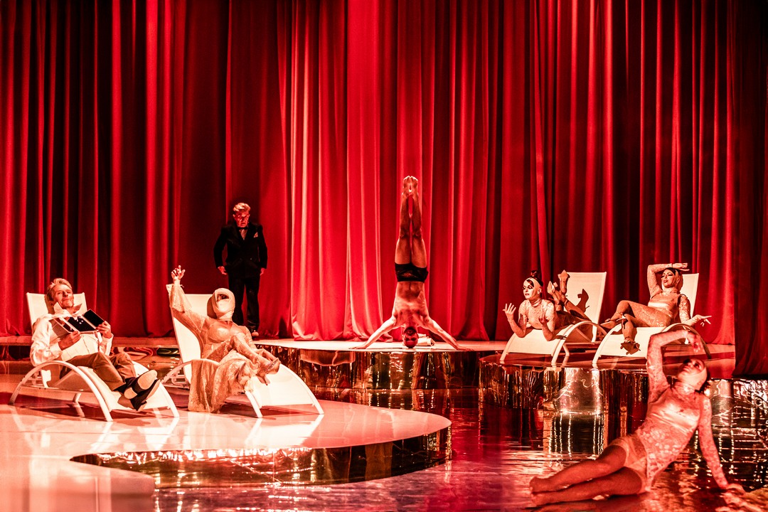 W Bielsku-Białej mamy podobny pomysł na tekst Gombrowicza, tyle że przeprowadzony konsekwentnie, wzmocniony scenografią, kostiumami, choreografią i muzyką. Wszystko jest podglądane okiem technologii – smartfona, aparatu fotograficznego czy kamery. To przemoc, widoczna zwłaszcza w scenach kamerowania Iwony kawałek po kawałku, a na dodatek łącząca się z innymi gestami przemocy naruszającymi cielesność bohaterki. Dworskie realia sztucznego świata z dramatu zostały przełożone na sytuację współczesnego społeczeństwa konsumpcji oraz spektaklu, kultu ciała i epatowania ciałem – pięknym, młodym, sprawnym; świata, który zdaje się salonem piękności, dyskoteką, czy reality show. Liczy się w nim uwaga innych i lajki, autokreowanie swojego życia w mediach społecznościowych. Obserwacja ta nie jest szczególnie oryginalna, między innymi od Guya Deborda wiemy, że żyjemy w społeczeństwie spektaklu[3], ale bez wątpienia ciekawie współgra z Gombrowiczowską wizją egzystencji wydanej na pastwę wzroku innych, rozgrywającej się w relacji z nimi.