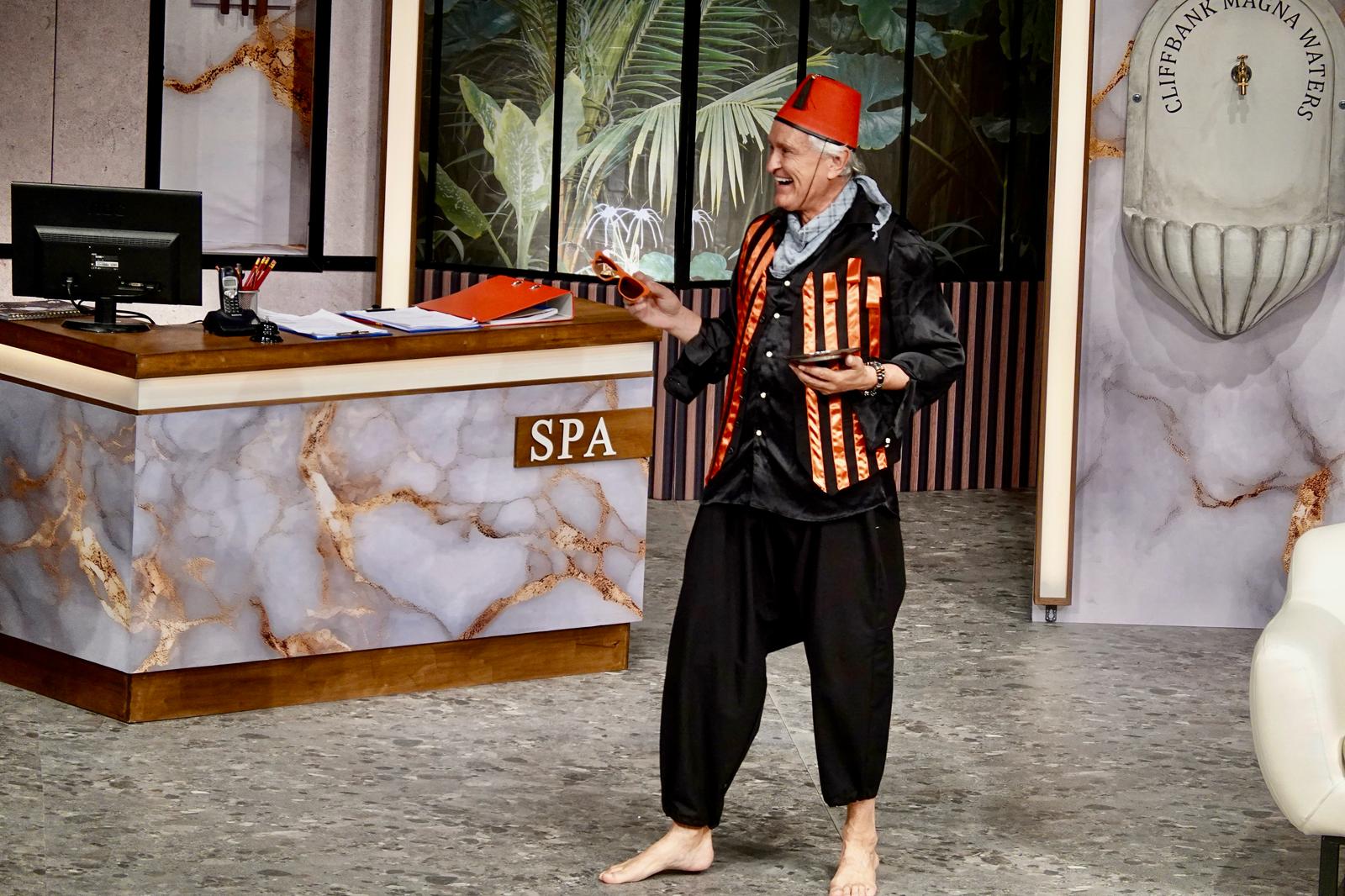 Szybkie zwroty akcji, błyskotliwe dialogi i cała galeria barwnych postaci, takich jak Olivia (Anna Bajer), teściowa Rolanda, Hooper (Krzysztof Grębski), sfrustrowany jeden z gości SPA, Vanessa (Marzena Oberkorn), żona byłego szefa Rolanda, i policjantka Campbell (Anna Makowska–Kowalczyk). A ponadto na scenie pojawia się manekin i … wielbłąd.