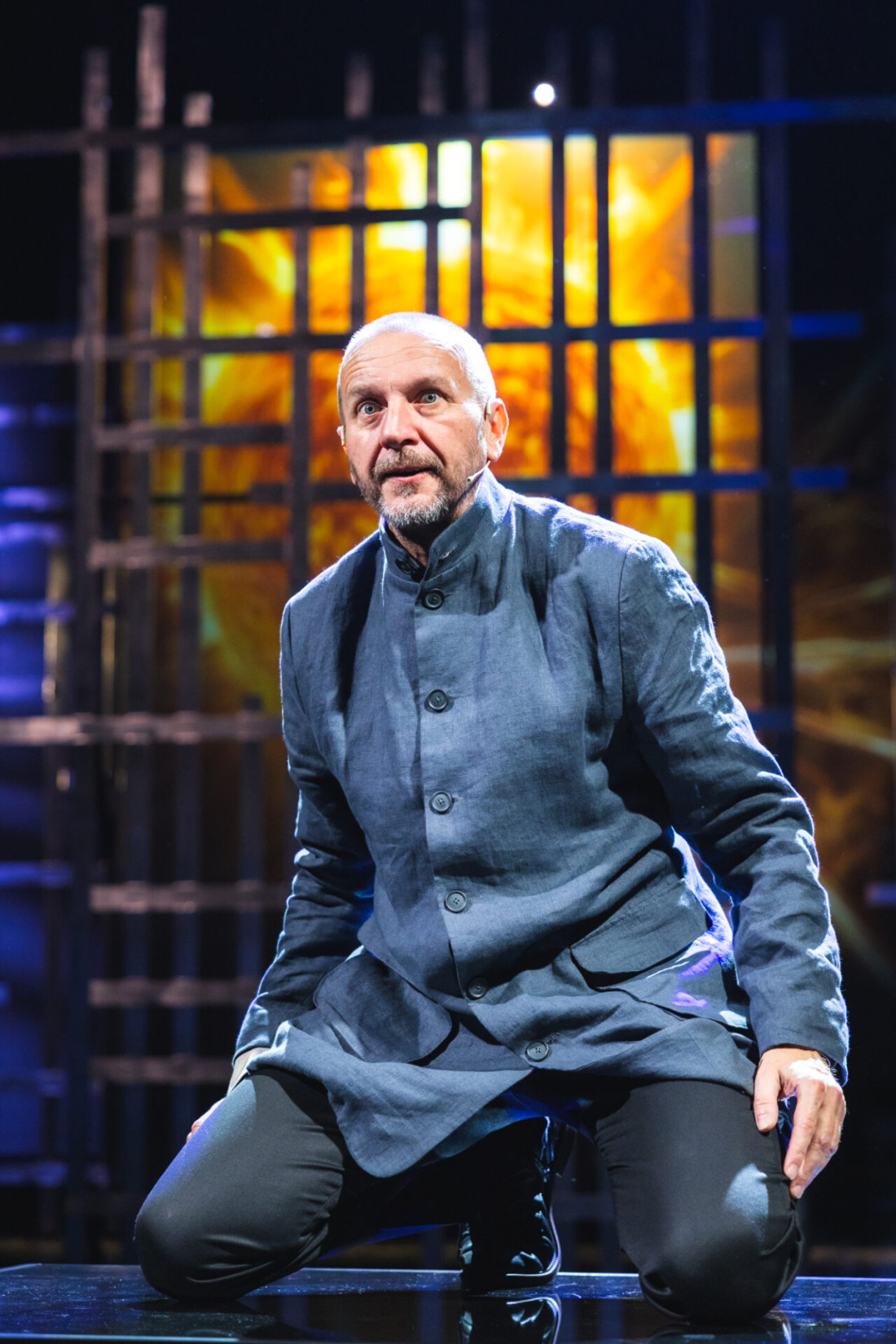 Mefistofeles, grany przez Michała Chołka, jest postacią zaprojektowaną świadomie pod oczekiwania młodej widowni. Wchodzi jako elegancki mężczyzna w czerni, poruszający się krokiem lekko wodewilowym. To diabeł światowy, „salonowy lew”, obyty i ironiczny, bardziej przewodnik niż kusiciel. Dopiero później – wraz z wyraźną zmianą kostiumu i estetyki – ujawnia swoją właściwą funkcję. Przestrzeń sceny przeobraża się w piekło, które nie ma nic wspólnego z metafizyczną grozą, lecz zostaje pokazane jako… koncert rockowy. Mefistofeles staje się gitarzystą rodem z Metalliki – diabłem popkulturowym par excellence.