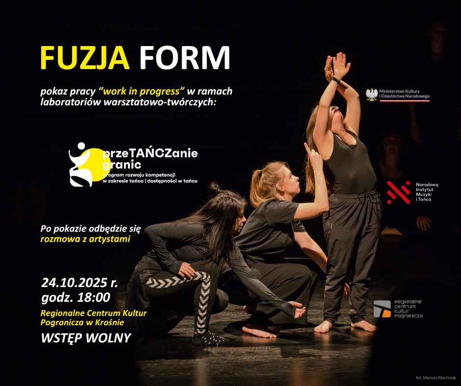Od 17 do 24 października 2025 roku Regionalne Centrum Kultur Pogranicza w Krośnie stanie się przestrzenią twórczych poszukiwań i tanecznych spotkań. W ramach programu „Przetańczanie Granic” odbędą się laboratoria warsztatowo-twórcze, podczas których artyści i artystki z różnych środowisk - z i bez niepełnosprawności, g/Głusi oraz neuroróżnorodni - będą wspólnie eksplorować ruch, improwizację i ekspresję ciała. Tydzień intensywnej pracy zakończy się pokazem „Fuzja Form” - prezentacją pracy w procesie (work in progress), podczas której publiczność będzie mogła zobaczyć efekty wspólnej twórczej podróży. Serdecznie zapraszamy wszystkich, którzy kochają taniec, sztukę i spotkanie ponad granicami - wrażliwości, form i doświadczeń.