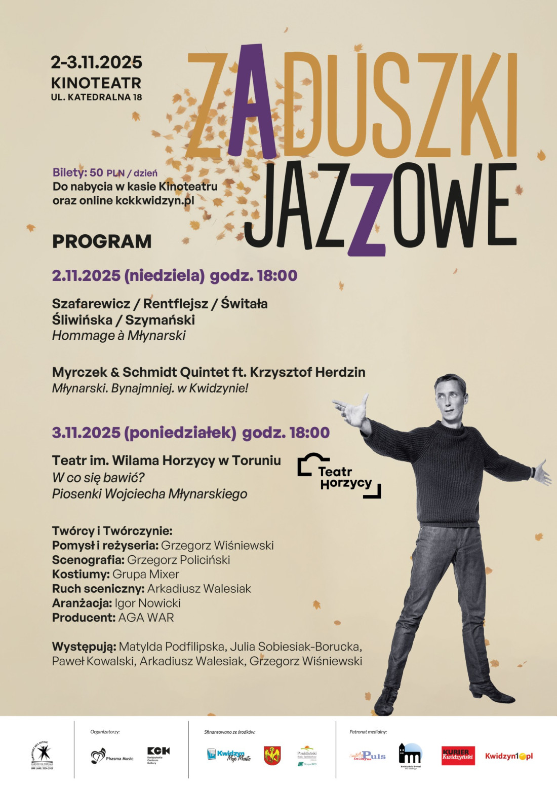 Pierwszy dzień Zaduszek Jazzowych to nowatorskie interpretacje piosenek Wojciecha Młynarskiego podczas koncertu zespołu N!EMOŻL!WE w składzie: Szafarewicz, Śliwińska, Szymański, Rentflejsz, Świtała w repertuarze „Hommage a Młynarski”.