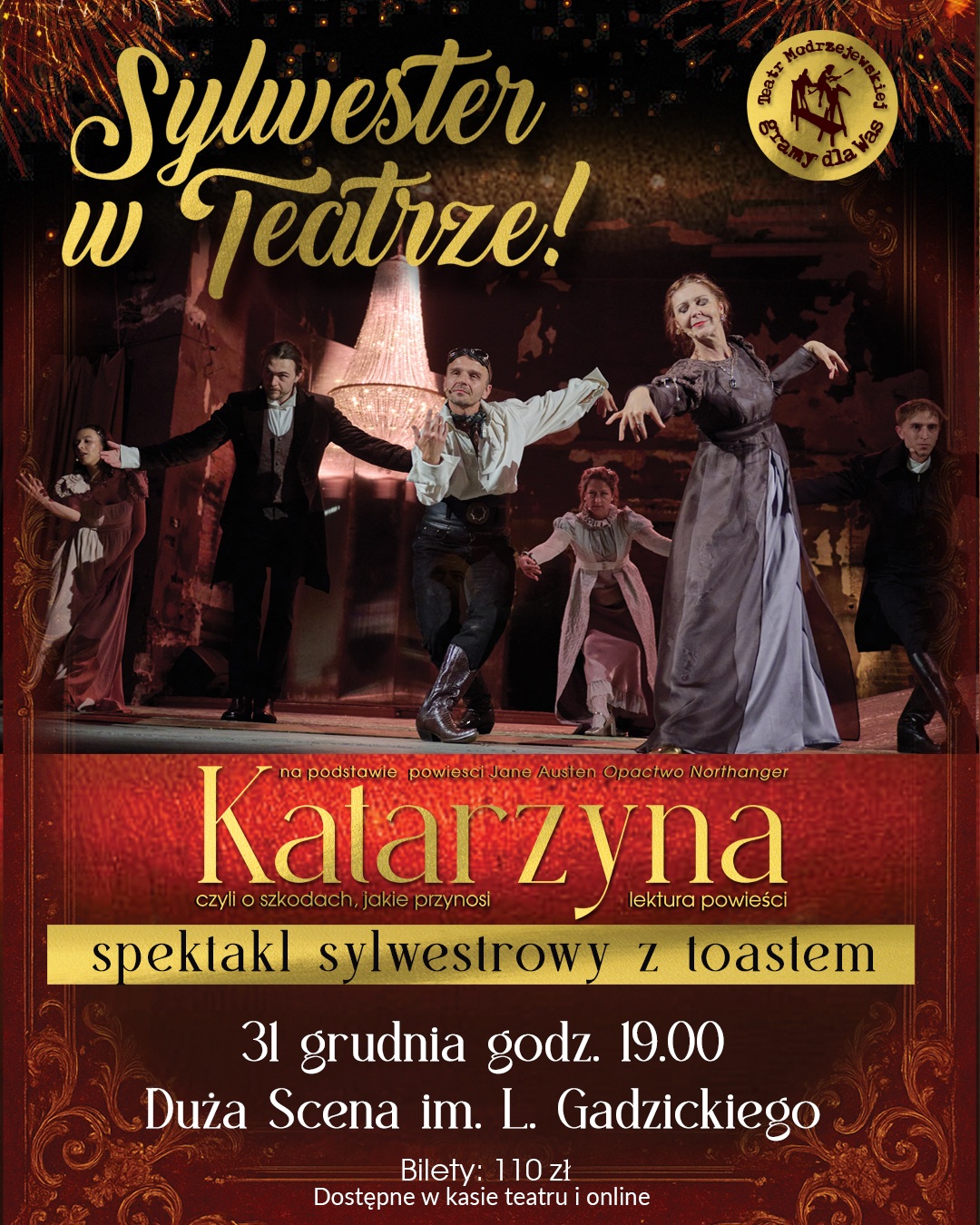 Podczas ubiegłorocznego Sylwestra w Teatrze odbył się huczny bal, któremu muzycznie towarzyszyła Kapela Hałasów. Tym razem organizatorzy zdecydowali o innej formie tego szczególnego spotkania z widzami. Głównym punktem programu będzie pokaz spektaklu na podstawie książki Jane Austen „Opactwo Northanger” w reżyserii Zofii Gustowskiej. Przedstawienie było ostatnią premierą propozycją Modrzejewskiej w poprzednim sezonie.