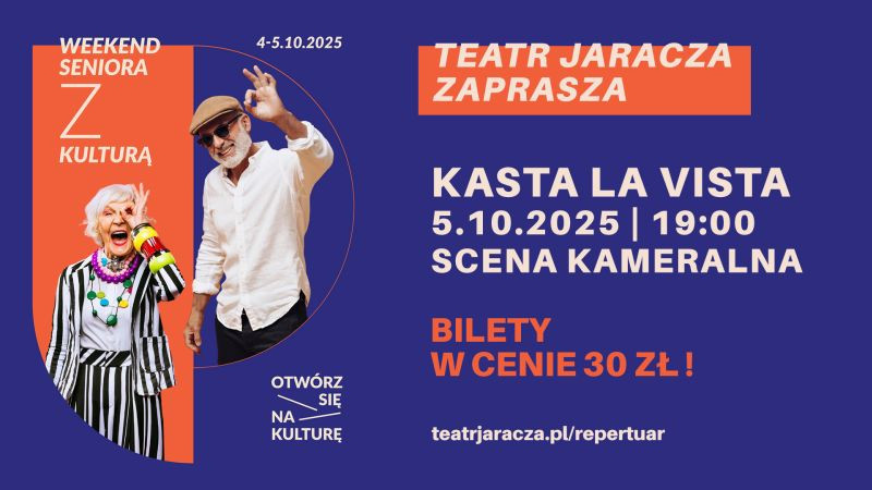 Październikowy Weekend Seniora z Kulturą to ogólnopolska akcja Ministerstwa Kultury i Dziedzictwa Narodowego, która łączy pokolenia i aktywizuje lokalną społeczność, zachęcając osoby powyżej 60. roku życia do udziału w życiu kulturalnym. Z okazji 12. edycji wydarzenia Teatr Jaracza przygotował pulę biletów w specjalnej cenie 30 zł na niedzielny (5 października) komediowy spektakl „Kasta la vista” w reżyserii Jacka Bończyka.