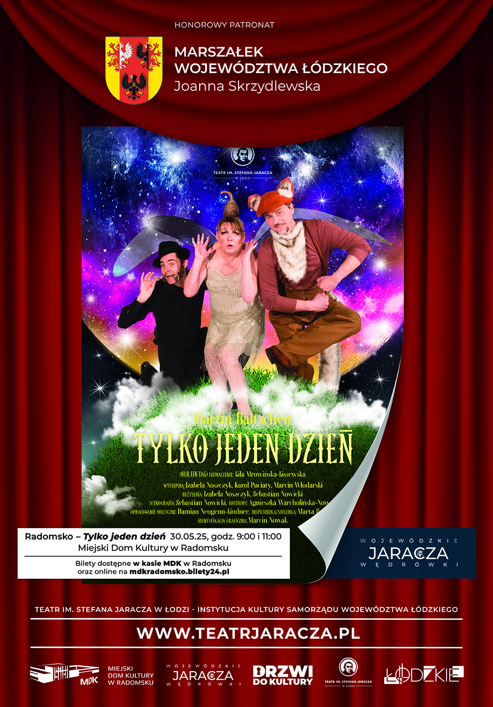 W maju i czerwcu teatr zaprezentuje swoje spektakle w Miejskim Domu Kultury w Radomsku. 30 maja o godzinie 9.00 i 11.00 Teatr Jaracza zaprasza szczególnie najmłodszych mieszkańców Radomska na bajkę „Tylko jeden dzień” w reżyserii Izabeli Noszczyk i Sebastiana Nowickiego. Widownia będzie mogła śledzić przygody trójki przyjaciół – Lisa (Marcin Włodarski), Dzika (Karol Puciaty) i Muszki Majowej (Aleksandra Posielężna). Spektakl przeznaczony jest dla widzów od lat 6 do 106!