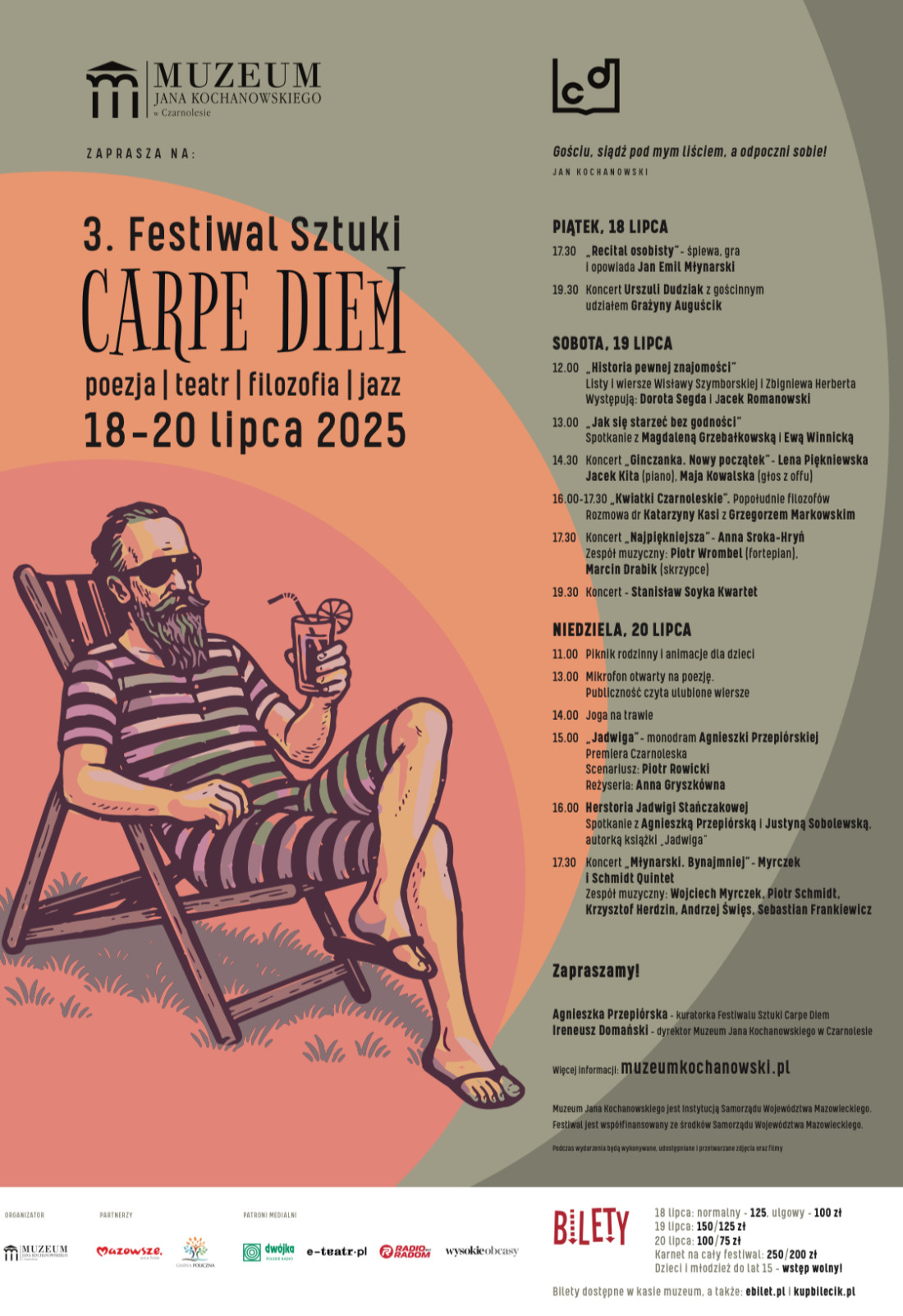 3. Festiwal Sztuki CARPE DIEM. Poezja. Teatr. Filozofia. Jazz odbędzie się w dniach 18-20 lipca na terenie Muzeum Jana Kochanowskiego w Czarnolesie. W programie festiwalu znalazły się spektakle teatralne, koncerty jazzowe, spotkanie filozoficzne, czytanie poezji, animacje dla dzieci i piknik rodzinny pod lipami. Na czarnoleskiej scenie pojawią się m.in. Urszula Dudziak, Grażyna Auguścik, Dorota Segda, Agnieszka Przepiórska, dr Katarzyna Kasia, Stanisław Soyka i Jan Emil Młynarski.