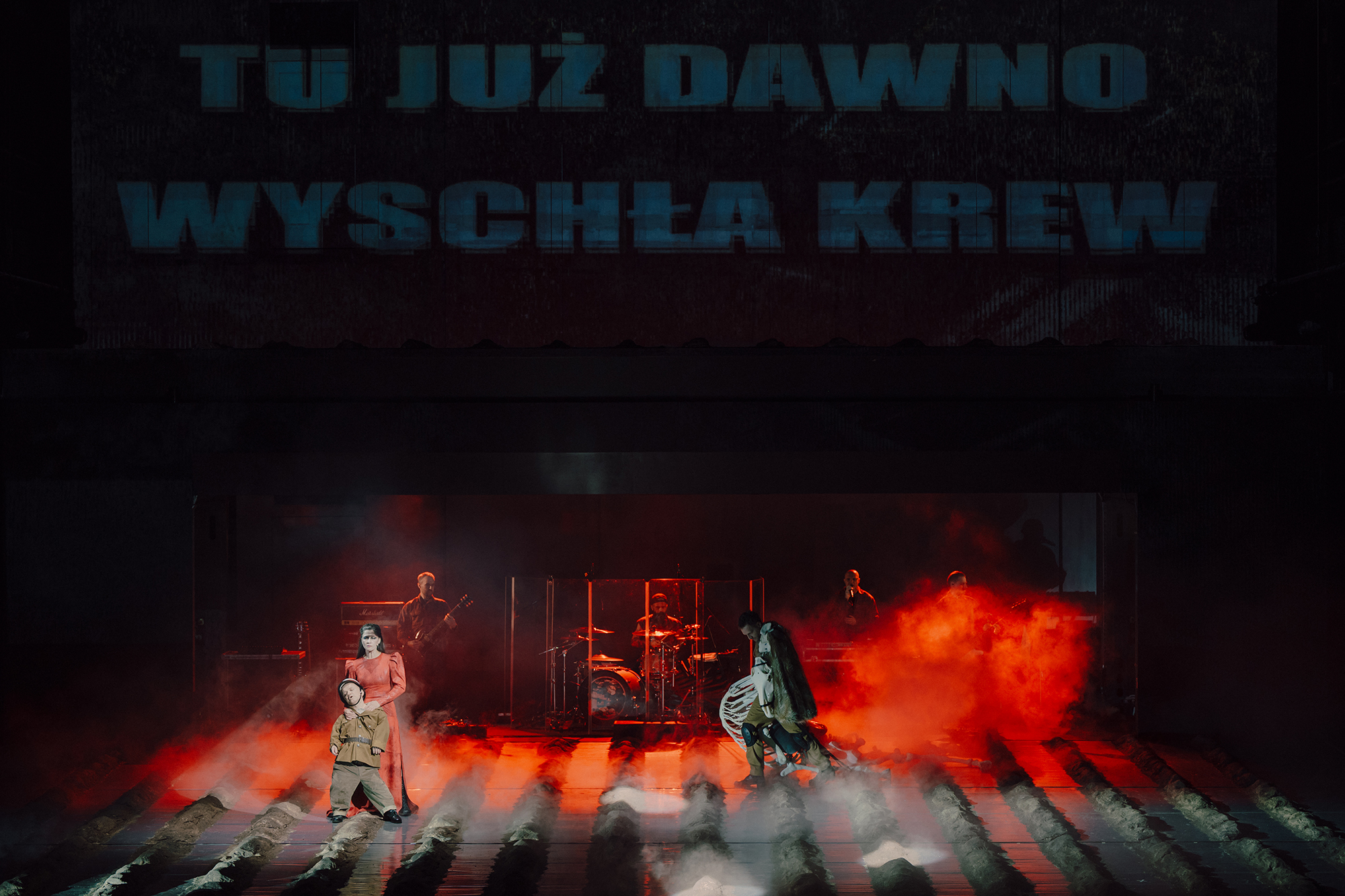 Wymowę spektaklu wzmacnia charakterystyczna dla teatru Klaty forma, idealne splecenie obrazu i dźwięku, czytelna w symbolice scenografia śmiało korzystająca z obrazów wideo - zgodnie zresztą z sugestią pisarza, najwyraźniej zafascynowanego filmowym montażem i rozmachem. Starannie przemyślana widowiskowość (ruchome podesty, sceny niemal pantomimiczne, m.in. scena rozbiorów Polski z trzema przenoszonymi z miejsca na miejsce szlabanami) i muzyka na żywo zespołu Gruzja tworzą zharmonizowaną z aktorami i statystami całość pulsującej materii, co chwila wysuwającej na czoło inny element widowiska. Metalowe, wściekłe piosenki Gruzji budują nastrój, nadają mu kierunek, akcentując współczesną wymowę przedstawienia. Czasem wręcz natarczywie, jak w pieśni „Aleksandria" do wiersza Dominika Gaca, w którym wybrzmiewa cała litania bolesnych miejsc: Verdun, Waterloo, Auschwitz, Charków, Katyń.
