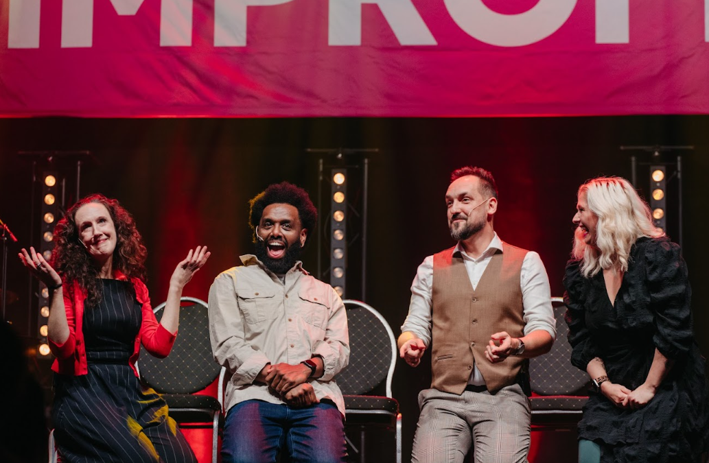 StaceJam, czyli improwizowany musical solo w wykonaniu Stacey Smith w towarzystwie Impro Bandu – och, co to był za spektakl! Od pierwszej do ostatniej nuty trzymał w napięciu i zaangażowaniu. Stacey opowiadała jednocześnie trzy historie, w których bohaterowie szukali siebie i próbowali spełnić marzenia. Już otwierająca piosenka “You can have it all” udowodniła, że będziemy mieć do czynienia z czymś nietuzinkowym. Razem z 10-letnim Bradley’em mierzyliśmy się z oczekiwaniami rodziców i walką o bycie w zgodzie ze sobą, obserwowaliśmy, jak wdowa Angela stara się ułożyć życie na nowo, a 30-letnia singielka zmaga się z dorosłością i internetowym poszukiwaniem miłości. Każdy z bohaterów był pełnowymiarową postacią, a każdy z wątków niezwykle emocjonujący.