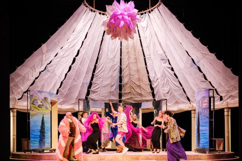 W inscenizacji pojawia się wiele zaskakujących elementów – scenografia z kwiatami lotosu, wielobarwne kostiumy, klimat komedii dell’arte oraz dyskotekowa muzyka. Do tego dochodzą zabiegi dobrze znane z wielu współczesnych scen: bezpośrednie zwroty do publiczności i wciąganie widzów w akcję. To rozwiązania efektowne, choć niekoniecznie pogłębiające sens całości. Nie brakuje też scen mocnych. Przemoc fizyczna wobec kobiety, przymusowe gesty uległości – jak mycie nóg mężowi – wprost ukazują stosunek do kobiet jako do własności.