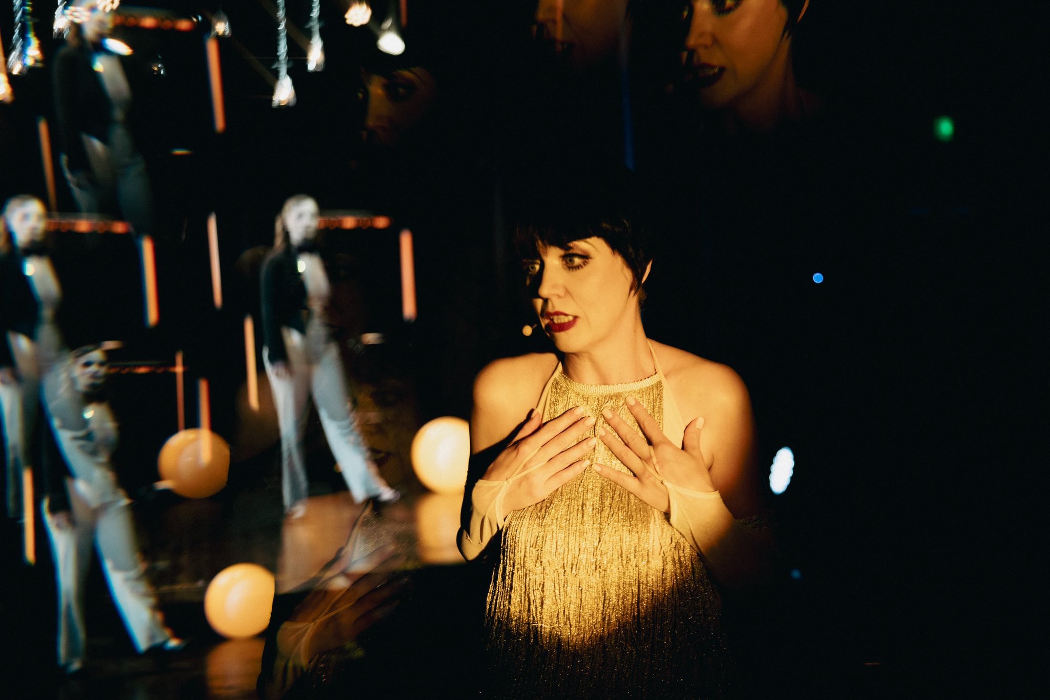 Mamy oto trupę teatralną, chwilę przed premierą Kabaretu Boba Fosse’a, opartego – warto to przypomnieć – na Pożegnaniu z Berlinem Christophera Isherwooda. Kostiumy gotowe, make-up zrobiony, chęci są, scenariusz również, talent dopisuje, a wspaniały gość (gościni – w sumie) zgodził się w tym sztosie ponownie wystąpić. Jednak gwiazda – jak to gwiazda – dość mocno się spóźnia, więc aktorzy zaczynają „szyć”, by jakoś zabawić oczekującą spektaklu publiczność… Uda się, czy ta katastrofa będzie zaiste piękna?