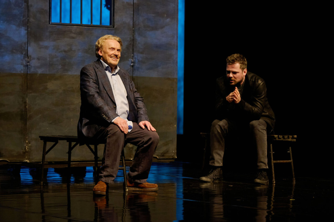 Bardzo oszczędna scenografia, która dzięki umiejętnie wprowadzonym antraktom pozwala przy wyciemnionych światłach dokonać szybkiej zmiany dekoracji, co umożliwia widzowi obserwować akcję dziejącą się w: mieszkaniu syna (Henryk – Kamil Kula, na zmianę z Tomaszem Karolakiem), restauracji; podwórku kamienicy czynszowej, celi więziennej czy na ławeczce stojącej na bulwarze spacerowym. Zmiany dekoracji są płynne i absolutnie nie rozbijają narracji, a wprost przeciwnie, podkreślają ją. Znakomicie ustawione są światła i projekcje wyświetlane na horyzoncie, z tyłu sceny.