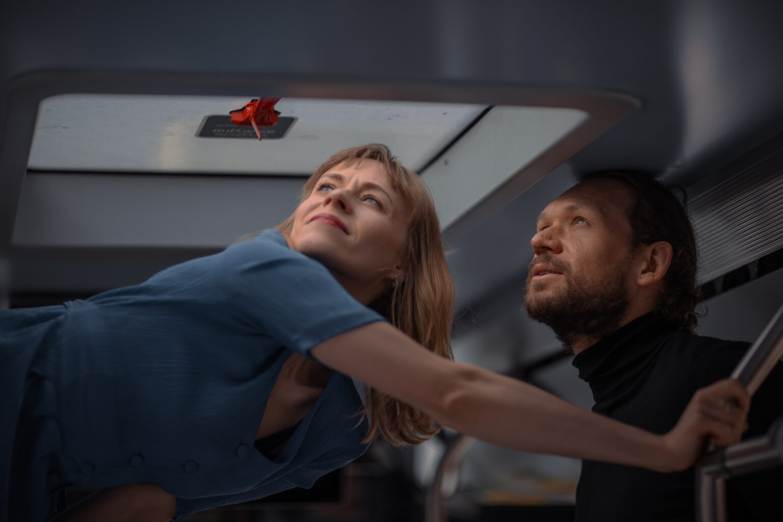 Podróż zaczyna się od początku, od poczęcia, Damian Droszcz jako Igor wsiada do autobusu z rajstopą naciągniętą na twarz, niczym plemnik, pierwiastek męski, który inicjuje życie i stwarza. Droszcz przepoczwarza się w rozmaite typy męskie, przybiera maski, tygrysie pazury i opowiada historię Igora, chłopaka, który szuka akceptacji w oczach ojca, potwierdzenia. Odgrzebuje wydarzenia z przeszłości, przeplata i zderza je z motywami biblijnymi, literackimi, a wszystko to, by przeglądać się w oczach rodziciela. Podnosi się przy tym na autobusowych drążkach, skacze, imponuje siłą i zręcznością. Jest w ruchu, jest w procesie, jest w drodze, symbolicznie i realnie. Początkowo ta droga wydaje się przypadkowa, zarówno w opowieści, jak i miejskim pejzażu za oknem, który jest tu tłem i daje możliwość dystansowania się od monologu bohatera. Jednak to tylko pozór, tu nic nie jest przypadkowe. Mijane miejsca i przystanki mają swój wyraźny sens w strukturze tego spektaklu. W momencie, gdy przywołany jest biblijny fragment o ofierze z Izaaka, autobus wjeżdża w przestrzeń, gdzie nagle robi się ciemno, bardzo to wymowne, przywołuje mrok, który zalewa od środka, gdy rodzic zdradza własne dziecko. Innym razem pojazd zatrzymuje się przy ukwieconym słupie z megafonem rozbrzmiewającym ni to wstydliwą litanią, ni spowiedzią przekraczającą tabu. W końcu zabiera z jednego z przystanków autobusowych ją, Weronikę. Partnerka Igora od razu wciela się w postać ojca, wchodzi w rolę tego, za którym bohater tęskni, aktywuje znaną mu matrycę emocjonalną, toksyczną formę bliskości. Joanna Rozkosz jako Weronika hipnotyzuje, wypełnia sobą całą przestrzeń autobusu, jej postać rośnie z każdym wypowiadanym słowem, przybiera to twarz ojca, ale i też matki, nadrodzica, który urasta do wszechpotężnej istoty o twarzy starotestamentowego boga. Krzykiem stwarza on świat, z którego nie ma ucieczki, który przygniata, dusi i paraliżuje strachem. Ten rodzić ma też twarz drugą, czułą, jak pramatka karmicielka, przepraszająca. Dwa skrajne bieguny miłość i przemoc sklejone w wyniszczający wzorzec. W czasie monologu Weroniki, Igor kurczy się do pozycji embrionu, wytraca całą moc, jest niczym wystraszona komórka o głodnych miłości oczach. Postać wykreowana przez Joannę Rozkosz pokazała, że przemoc nie ma płci, może meandrować pomiędzy tym, co męskie i żeńskie.