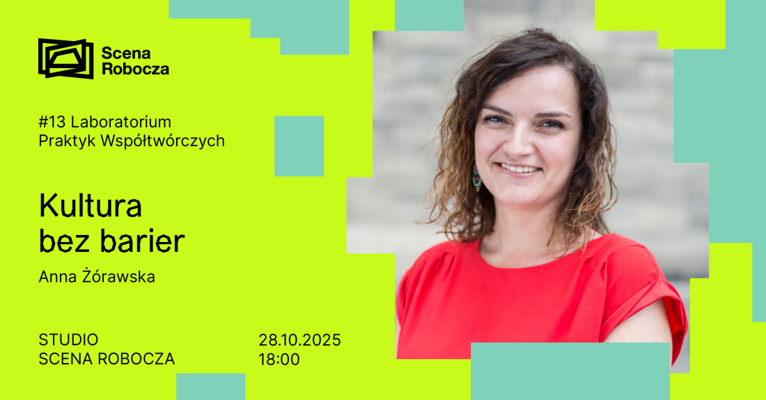 Stowarzyszenie Scena Robocza zaprasza 28 października na kolejną dyskusję w ramach Laboratorium Praktyk Współtwórczych. Gościnią 13 spotkania będzie Anna Żórawska – pomysłodawczyni, inicjatorka i prezeska Fundacji Kultury Bez Barier; ekspertka ds. dostępności, trenerka, autorka licznych publikacji i audiodeskryptorka.