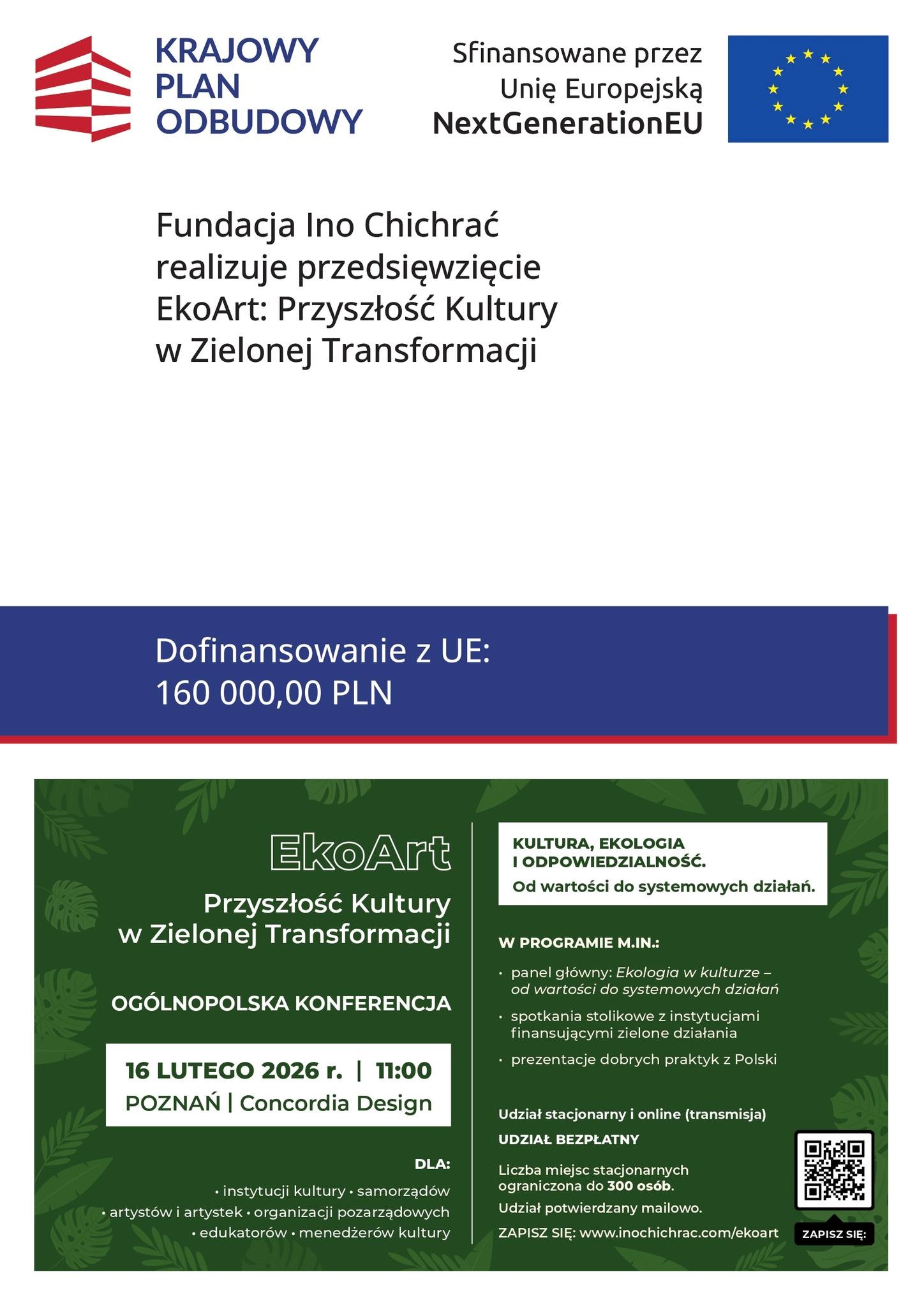 Organizator: Fundacja Ino Chichrać Projekt: „EkoArt: Przyszłość Kultury w Zielonej Transformacji” Projekt jest współfinansowany ze środków Krajowego Planu Odbudowy i Zwiększania Odporności (KPO), w ramach instrumentu NextGenerationEU. Dofinansowanie z UE: 160 000,00 PLN