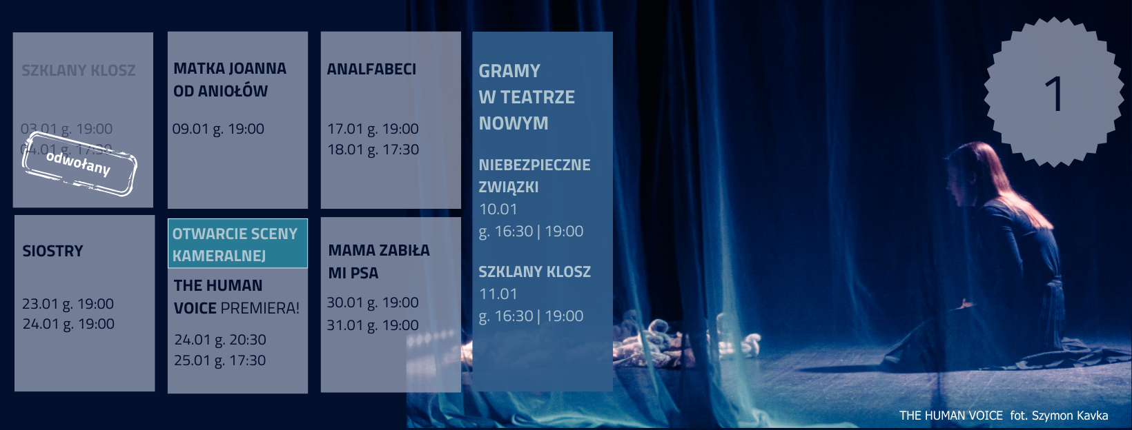 Pierwszym wydarzeniem prezentowanym na Kameralnej Scenie STA będzie monodram The Human Voice, inaugurujący działalność nowej przestrzeni. Spektakl jest autorską realizacją inspirowaną dramatem Jeana Cocteau – nie adaptacją, lecz jego dekompozycją. Twórcy sięgają po fragmenty klasycznego tekstu, przepisując je przez współczesne wrażliwości, z wyraźnymi odniesieniami do estetyki Sary Kane i filmowego języka Pedra Almodóvara.