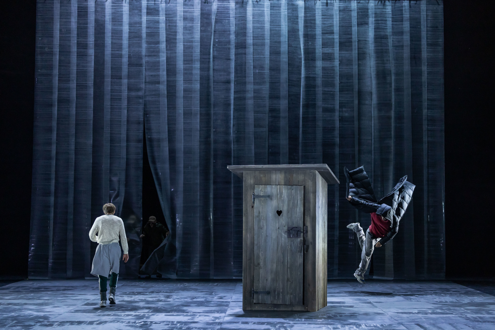 Przenieśmy się w świat przedstawiony na scenie – surowy, w półmroku, z miejscem na wizuale i projekcie; wychodek w samym sercu scenografii – na wychodku także serce. Spektakl zaczyna się nagle, ucina dyskusje, pozostają szmery i nerwowe gmeranie przy wyłączaniu dźwięku w telefonach, bo nikt nawet nie uprzedził widzów, że to już. No właśnie – bo z tego świata, toczącej się wojny hybrydowej, nalotów dronowych, niepokoju, mamy zostać oderwani, a po pobycie w Soplicowie zwróceni.
