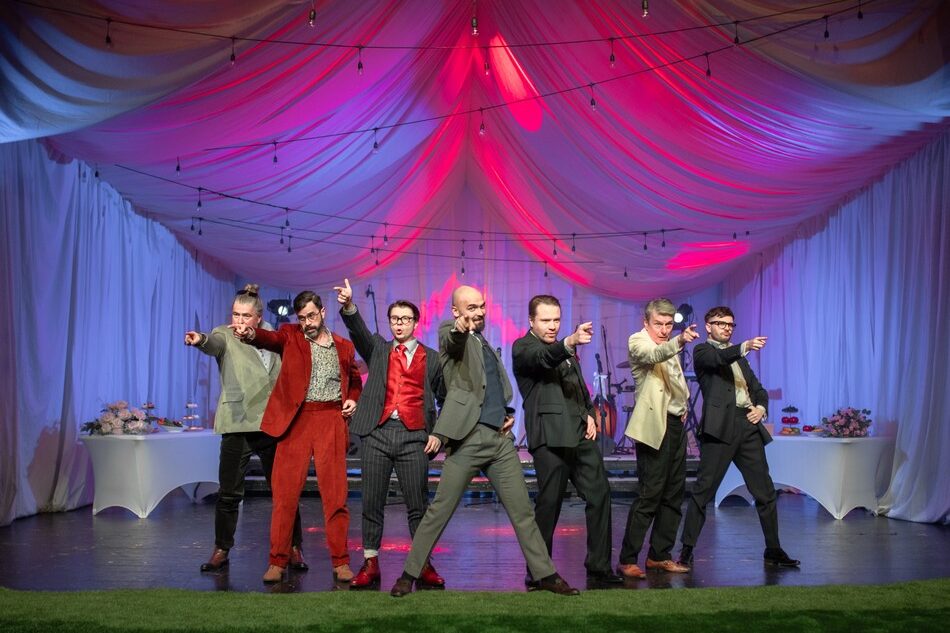 Sławomir Miska jako Tytus — kelner-samochwała, jurny uwodziciel, a w głębi duszy dobroduszny typ — gładko stapia się z bohaterem. Grzegorz Sikora, grający ojca pana młodego, w punkt oddaje wady i zalety oraz egoizm Stavrosa, podstarzałego, lecz wciąż dziarskiego pożeracza damskich serc. Tomasz Lorek jest niemal wymarzonym rockmanem Fistachem, prześladowanym przez życiowego pecha. Równie naturalnie i swobodnie wypada Piotr Gajos jako magister Miśkiewicz, zwany Robalem — nieporadny, choć oczytany naukowiec, obdarzony ogromną wiedzą na temat zwierzęcej i ludzkiej biologii płci. Grzegorz Margas, wcielający się w Sebastiana Tretyna, pracownika agencji reklamowej, bawi do łez rzucanymi mimochodem uwagami. Ciekawość budzi także Mateusz Wojtasiński w roli Janisa, brata pana młodego — kochającego męża i ojca, który również nie należy do ideałów. Michał Czaderna jako sam pan młody, nieszczęśliwy i pocieszny Kornel, wydaje się niezwykle sympatyczny, choć i on ma swoje za uszami. Siła i wiarygodność spektaklu płyną z gry całego zespołu, rzadkich monologów oraz dominujących scen zbiorowych.