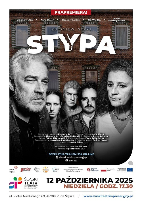 Śląski Teatr Impresaryjny im. Henryka Bisty w Rudzie Śląskiej zaprasza na prapremierę sztuki „Stypa”. Scenariusz i reżyseria: Zbigniew Stryj. Transmisja spektaklu online, na żywo, na profilach: Facebook i YouTube.