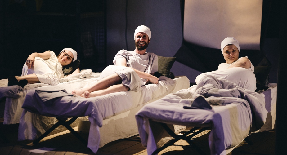 Najpierw podano każdej osobie do wypicia magiczny eliksir, czyli kakao (a przynajmniej na to wskazywał jego smak), następnie miskę do obmycia nóg (rytualnego?). Obie te czynności aktorzy wykonywali z hipnotyzującą starannością i powolnością, zatrzymując się przy każdym z łóżek. Operowali magiczną machiną z wodą, zakończoną nastrojowo podświetlaną rurką – kranikiem. Ich czarne kostiumy z jasnymi mazańcami przypominającymi kości i podobne w kolorze nakrycia głowy, w których można znaleźć zarówno wariację na temat czepka siostry Ratched z „Lotu nad kukułczym gniazdem”, jak i czapek muezinów czy derwiszy. Bo też znaleźliśmy się nie tylko w przestrzeni głęboko symbolicznej, ale i w piorunującym miksie kulturowym, po którym nie sposób chadzać utartymi szlakami. Bo ich zwyczajnie nie ma. Z jednej strony czujemy się niczym w duńskiej krainie hygge – zrelaksowani i zaopiekowani, z drugiej nie wiemy, co za chwilę z nami zrobią. W multimedialnych obrazach widzimy plenery, można się poczuć trochę jak na kempingu, na obozie młodzieżowym, z jego wspólnotowością, wyjściem z oficjalnych powinności i ról, pożyczaniem pasty do zębów w łazience. Spać czy nie spać? Każdy sam podejmuje decyzję. Niektórzy po „kakałku” padają jak kawki, inni walczą z opadającymi powiekami. Bo jest czego słuchać i na co patrzeć, chłonąć wszelkimi zmysłami.