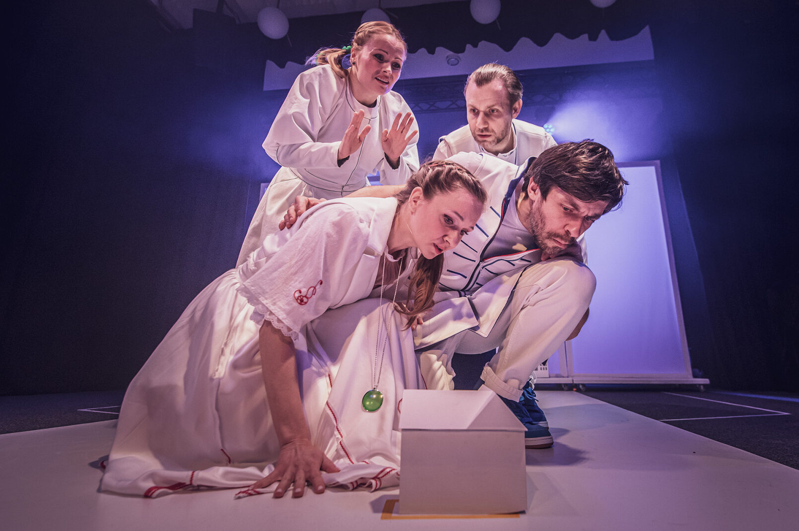 Sensorycznym doznaniom pomaga kameralność uzyskana dzięki nietypowej scenie w postaci białego paska zakończonego dwoma ściankami (do czasu). Zabieg ten pozwala zachować granicę między sceną a publicznością, a jednocześnie skraca dystans między światem przedstawionym a rzeczywistym.