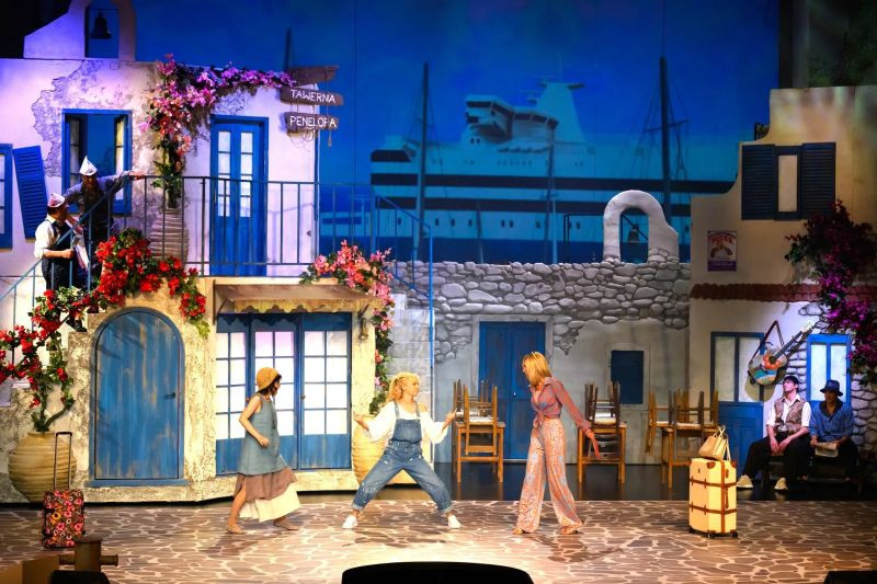 Scenograficznie jest klasycznie. Grzegorz Policiński stworzył duże, realistyczne dekoracje przedstawiające grecką tawernę i dom oraz fragment nabrzeża, za którym rozciąga się wyświetlony obraz morza, nieba, zacumowanej łodzi, uzupełniający przestrzeń sceniczną. Boczne części sceny zostały także zaaranżowane na fragment nabrzeża i część uliczki drzwiami, skrzynką pocztową i schodkami prowadzącymi do dzwonu, do którego kilkakrotnie w czasie spektaklu wspina się jedna z mieszkanek wyspy. Tawerna zostaje w czasie spektaklu odwrócona, aby ukazać swoje wnętrze. Pojawia się pomost i fragment greckiej świątyni. To świetne teatralne tło, którego często obecnie w teatrze brakuje, bo wszystko zastępują ekrany LED i wizualizacje. Animacje Veraniki Siamionavej i Zachariasza Jędrzejczyka tu są dopełnieniem scenografii, a nie próbują jej zastępować. Świetnie wykorzystane są jako wprowadzenie, kiedy w trakcie uwertury oglądamy kolejne kartki z pamiętnika Donny i podobnie jak Sophie dowiadujemy się kim byli dla jej mamy Sam, Bill i Harry. Scenografię dopełnia świetne wykorzystanie świateł, za których reżyserię odpowiedzialni są Grzegorz Policiński i Artur Wytrykus.