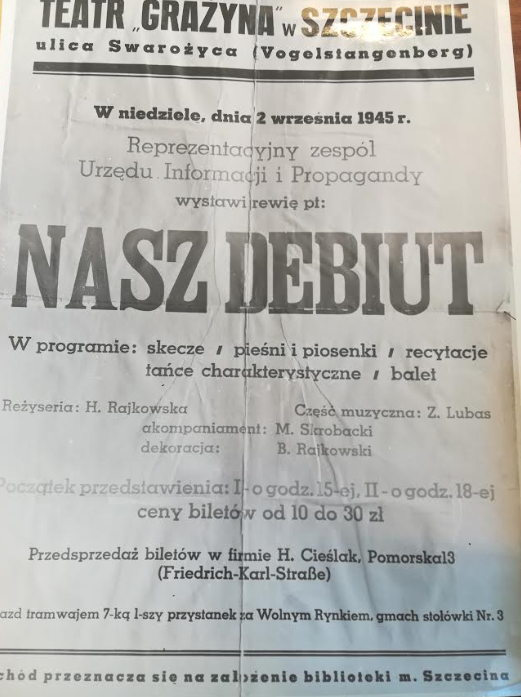 We wrześniu w szczecińskim Teatrze Polskim odbędą się wydarzenia pod wspólnym tytułem: „Stettin – Szczecin”. Inspiracją do nich było pierwsze widowisko teatralne w polskim Szczecinie, osiemdziesiąt lat temu. 2 września 1945 roku Teatr Grażyna wystawił, w sali przy ulicy Swarożyca 5, program artystyczny: „Nasz debiut”. Widowisko było składanką estradową pieśni i piosenek, recytacji, skeczy, układów tanecznych.