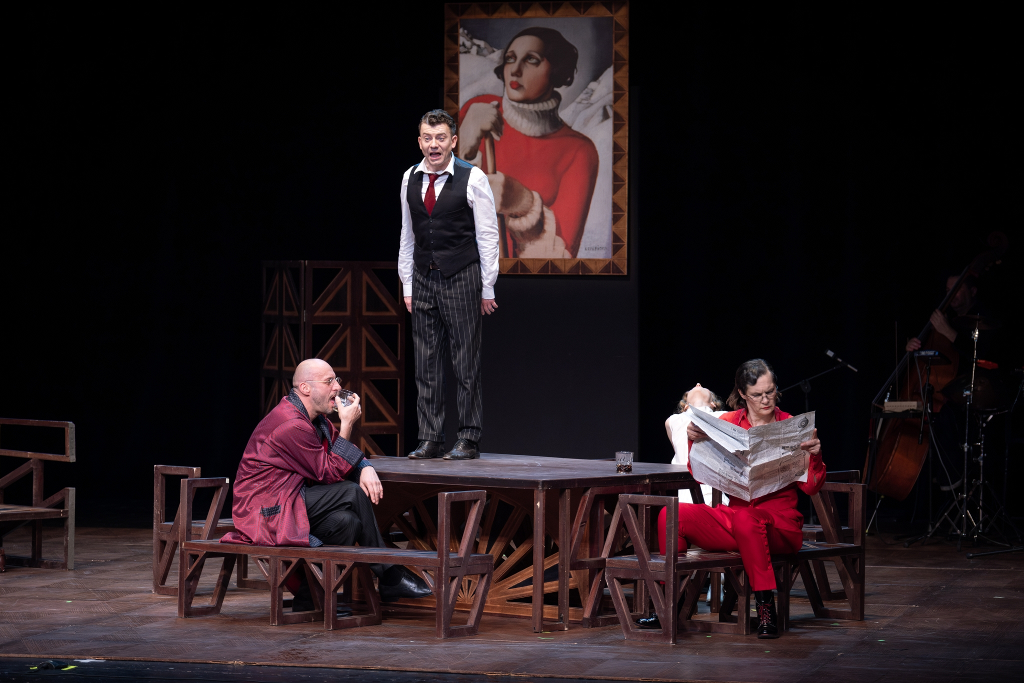 Wizualna strona przedstawienia – choć względnie prosta, nieprzeładowana – także się sprawdza. Głównym elementem scenografii (Aleksandra Żurawska według pomysłu Mariusza Malca) są wielofunkcyjne, zaprojektowane niczym klocki lego stoły i ławy, które można łatwo i szybko układać w dowolne kompozycje. Ciekawym, choć nie do końca dla mnie zrozumiałym tropem jest zawieszenie obrazu Saint-Moritz (1929) Tamary Łempickiej w głębi sceny, jakby swoją obecnością miała ona matronować przedstawionym wydarzeniom. Przyznaję, dało to niezły efekt wizualny, szczególnie że ławy i stroje bohaterów zdawały się subtelnie nawiązywać do stylu art déco, jednak nie udało mi się rozsupłać tego związku. Do twórczości Łempickiej nawiązują także kostiumy projektu Zofii de Ines. Większość z nich to raczej typowa moda lat 30. XX wieku, jednak niektóre wyraźnie powtarzają ten trop. Dla przykładu: strój Zuty Młodziakówny (Maria Kłusek) jest odtworzeniem obrazu Saint-Moritz, czerwony kostium jej matki (Maria Seweryn) przywołuje Portret pani Bush (1929), a suknia Zosi Hurleckiej (ponownie Maria Kłusek) wprost nawiązuje do obrazu Młoda dziewczyna w zielonej sukience (1927–1930). Niewątpliwie oddaje to ducha epoki, podkreśla jej dynamiczność i nowoczesność, jednak mam nadzieję, że twórcy są w tej kwestii mądrzejsi ode mnie i sens rzeczywiście tam jest, bo byłoby rozczarowaniem i marnotrawieniem energii budowanie pustych odwołań dla samego ich faktu. Spektaklowi towarzyszy także muzyka wykonywana na żywo przez Karima Martusewicza i jego syna Nelsona, która jeszcze bardziej dynamizuje i tak całkiem dynamiczną akcję.