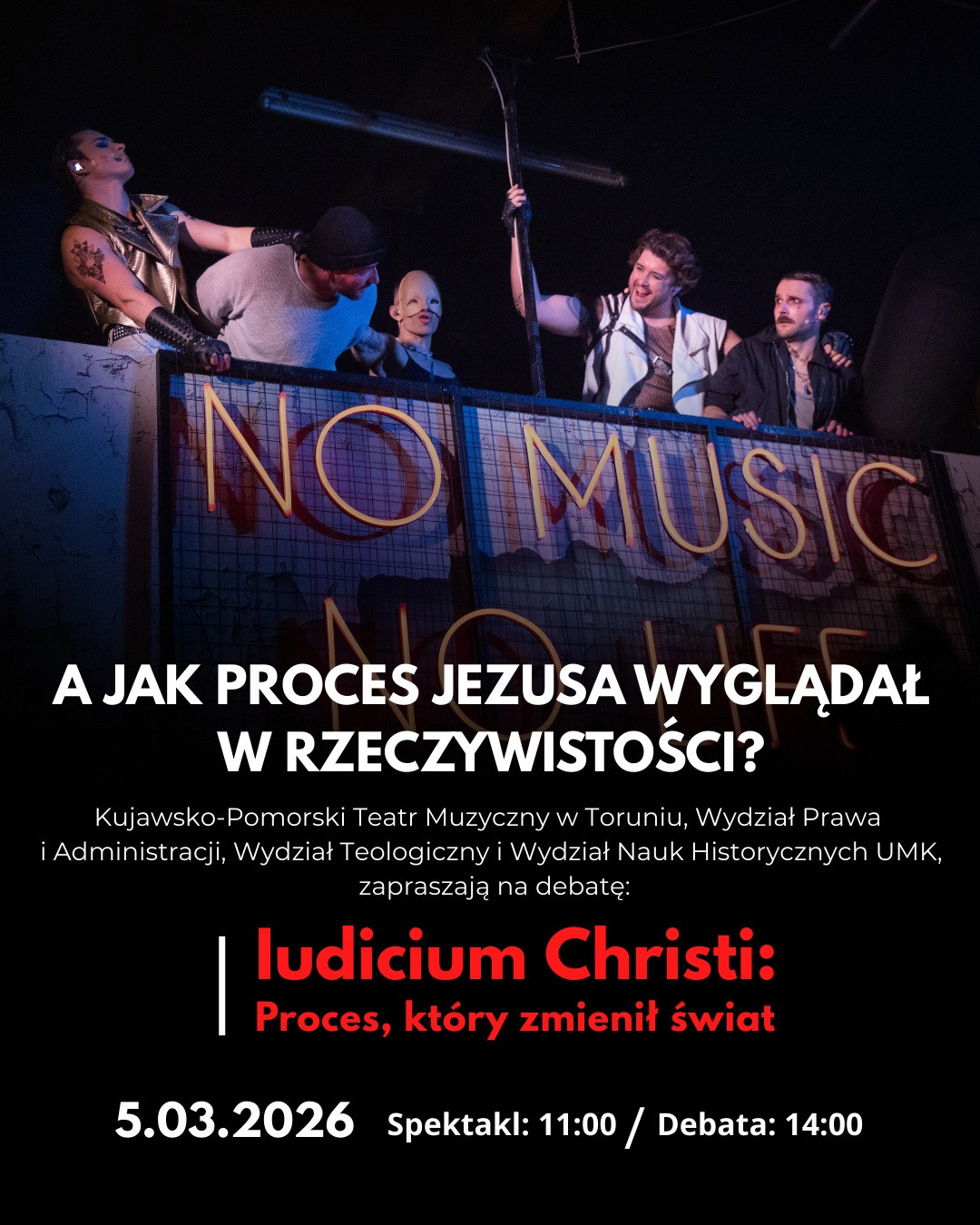 Kujawsko-Pomorski Teatr Muzyczny w Toruniu zaprasza na specjalne wydarzenie towarzyszące spektaklowi „Jesus Christ Superstar” – debatę „Iudicium Christi: Proces, który zmienił świat”. W spotkaniu wezmą udział historycy, prawnicy, teologowie oraz przedstawiciele obsady i twórców spektaklu. Debata odbędzie się 5 marca w Klubie Od Nowa w Toruniu po porannym pokazie musicalu. Wstęp na debatę jest otwarty.